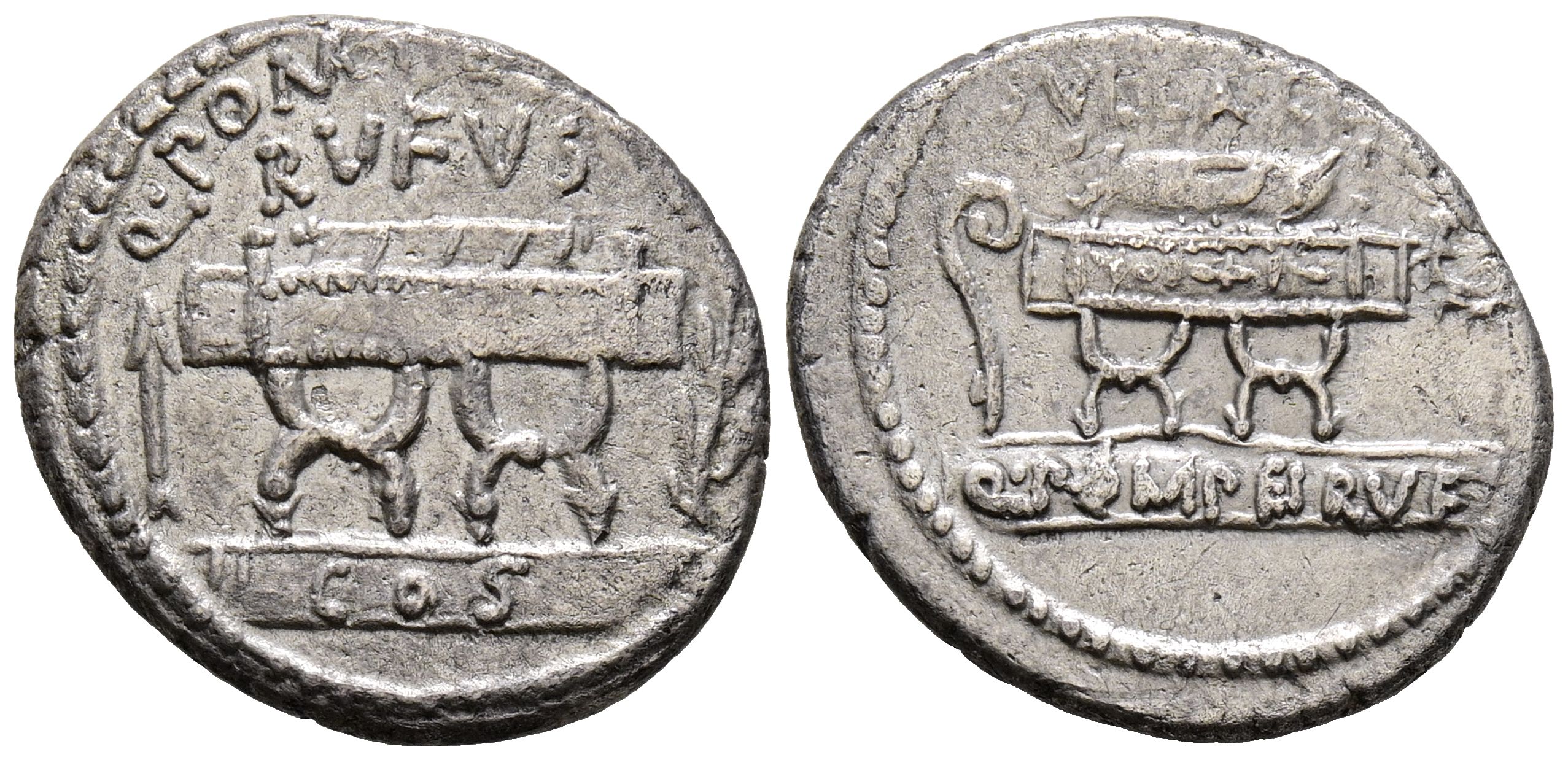 GENS POMPEIA. Denario. (Ar. 3,69g/18mm). 54 a.C. Roma. (FFC 1025; Crawford 434/2). Anv: Silla curul flanqueada entre flecha y rama de laurel, encima leyenda: Q POMPEI Q F/RVFVS, debajo: COS. Rev: Silla curul flanqueada por lituo y corona de laurel, encima leyenda: SVLLA COS, debajo: Q POMPEI RFV. MBC+.