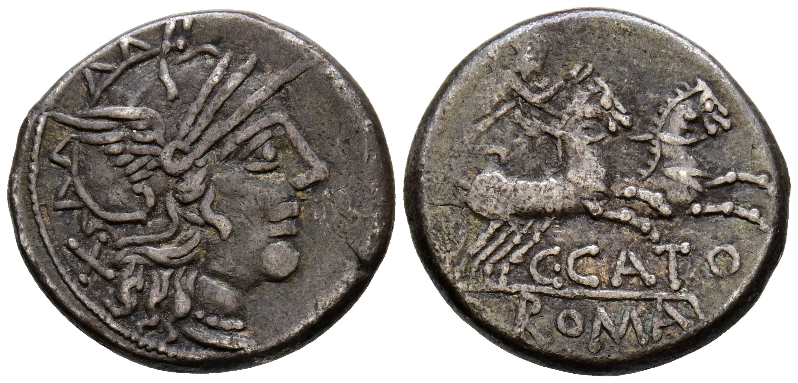 GENS PORCIA. Denario. (Ar. 3,86g/18mm). 123 a.C. Taller auxiliar de Roma. (FFC 1050; Crawford 274/1). Anv: Cabeza de Roma a derecha, detrás X. Rev: Victoria con látigo en biga a derecha, deBajo leyenda: C CATO, en exergo: ROMA. MBC.