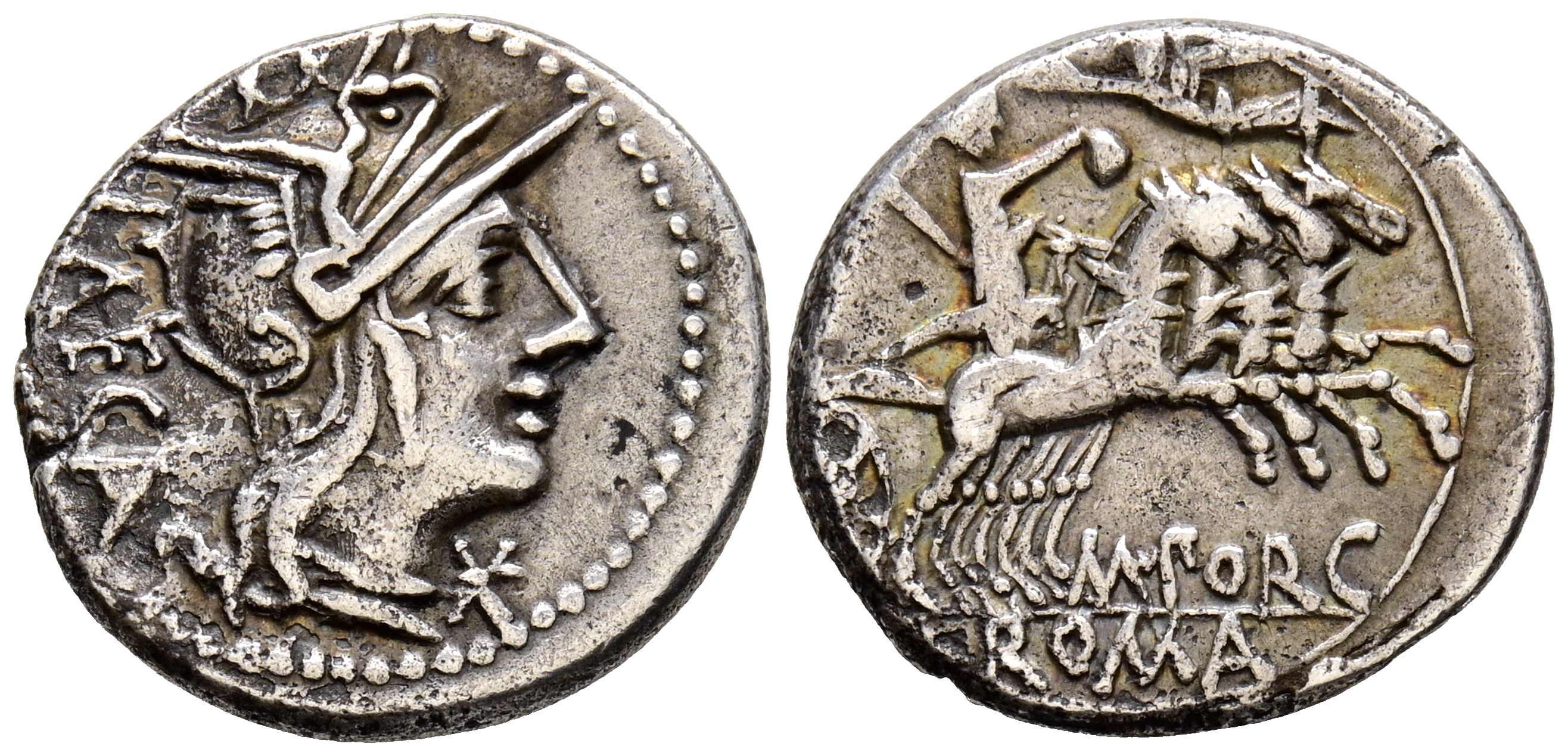 GENS PORCIA. Denario. (Ar. 3,81g/18mm). 125 a.C. Roma. (FFC 1051; Crawford 270/1). Anv: Cabeza de Roma a derecha, delante estrella, detrás leyenda: LAECA. Rev: Libertas conduciendo cuádriga a derecha y siendo coronado por Victoria con corona de laurel, debajo: M PORC, en exergo: ROMA. MBC.