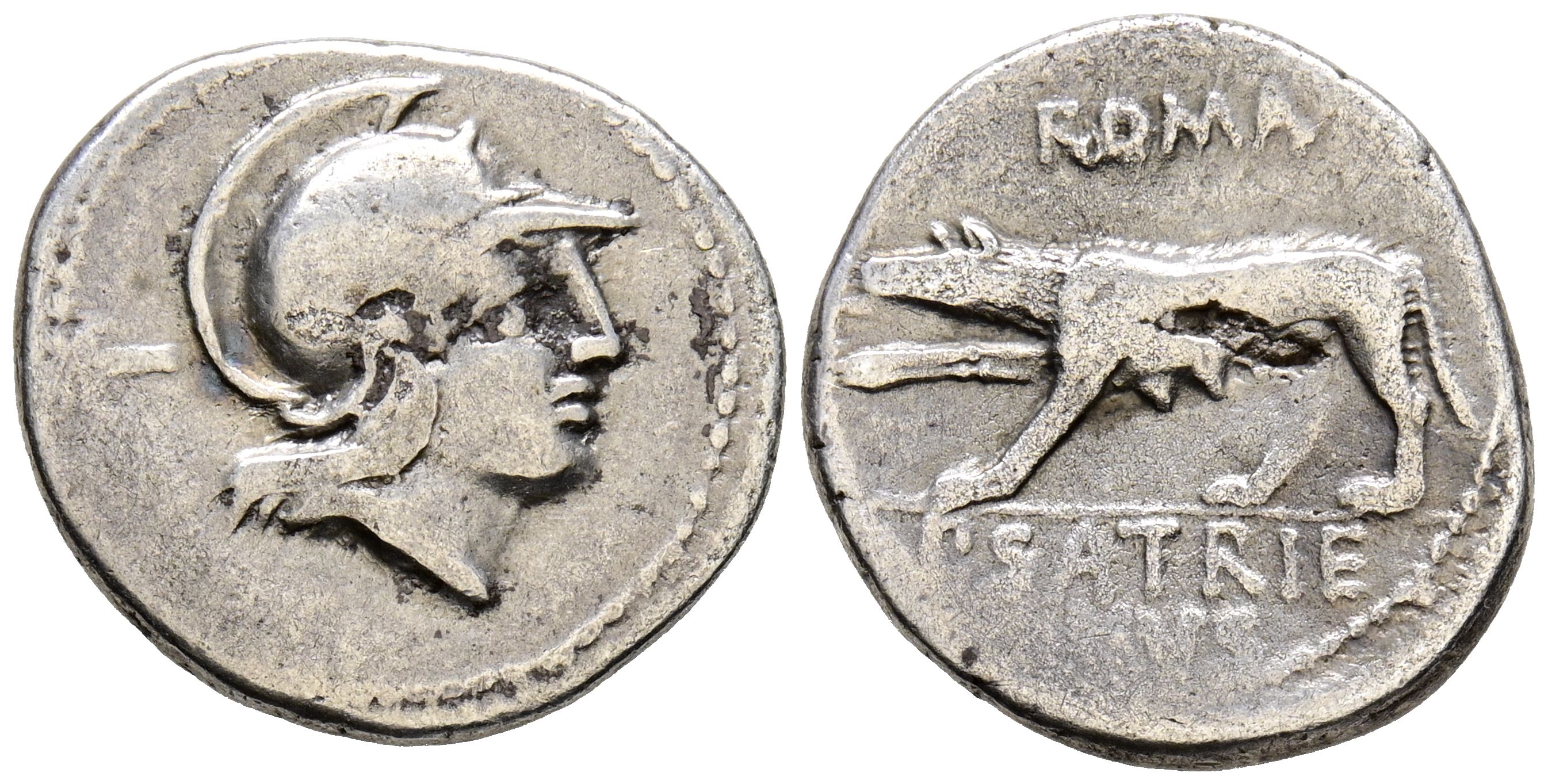 GENS SATRIENA. Denario. (Ar. 3,64g/17mm). 77 a.C. Roma. (FFC 1097; Crawford 388/1b). Anv: Cabeza de Marte a la derecha, detrás número: L. Rev: Loba a la izquierda, arriba leyenda: ROMA, abajo: P SATRIE/NVS. MBC.