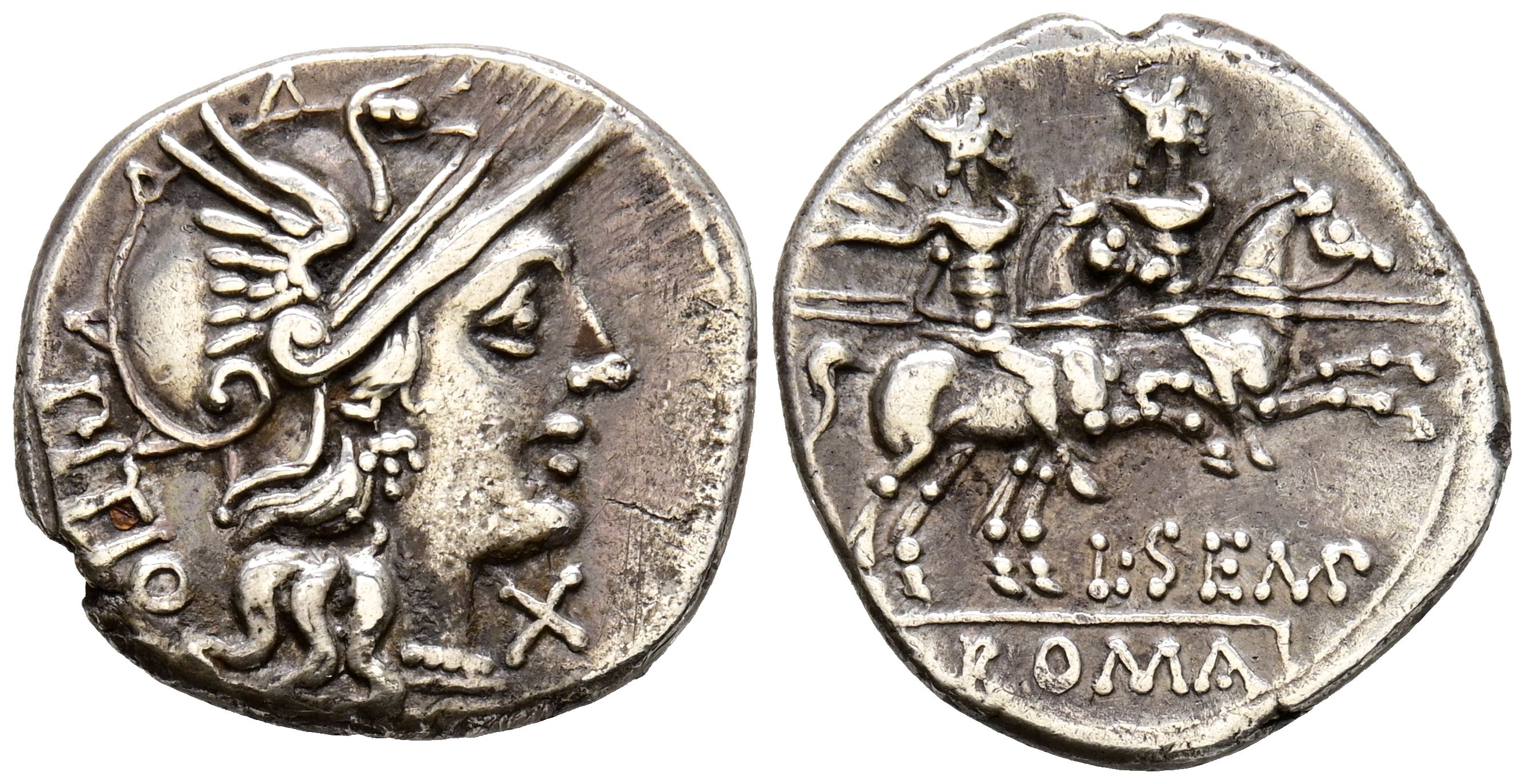 GENS SEMPRONIA. Denario. (Ar. 3,71g/19mm). 148 a.C. Roma. (FFC 1107; Crawford 216/1). Anv: Cabeza de Roma con casco a derecha, delante: X, detrás leyenda: PITIO. Rev: Dioscuros a caballo a derecha con lanzas, encima de ambos estrellas, debajo leyenda: L SEMP, en exergo: ROMA. MBC.