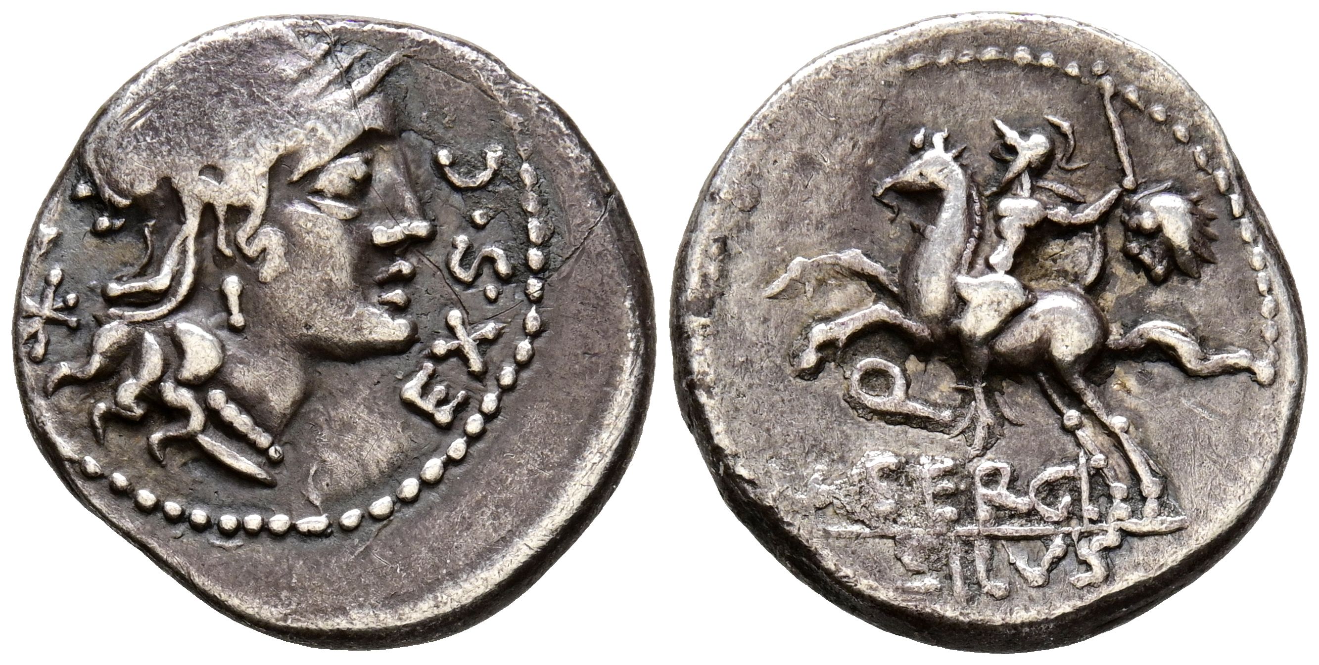 GENS SERGIA. Denario. (Ar. 3,73g/19mm). 116-115 a.C. Norte de Italia. (FFC 1111; Crawford 286/1). Anv: Cabeza de Roma a derecha, detrás estrella, detrás: ROMA, delante: EX SC. Rev: Jinete con espada a izquierda en el campo cabeza de galo, debajo leyenda: Q M SERGI, en exergo: SILVS. MBC.