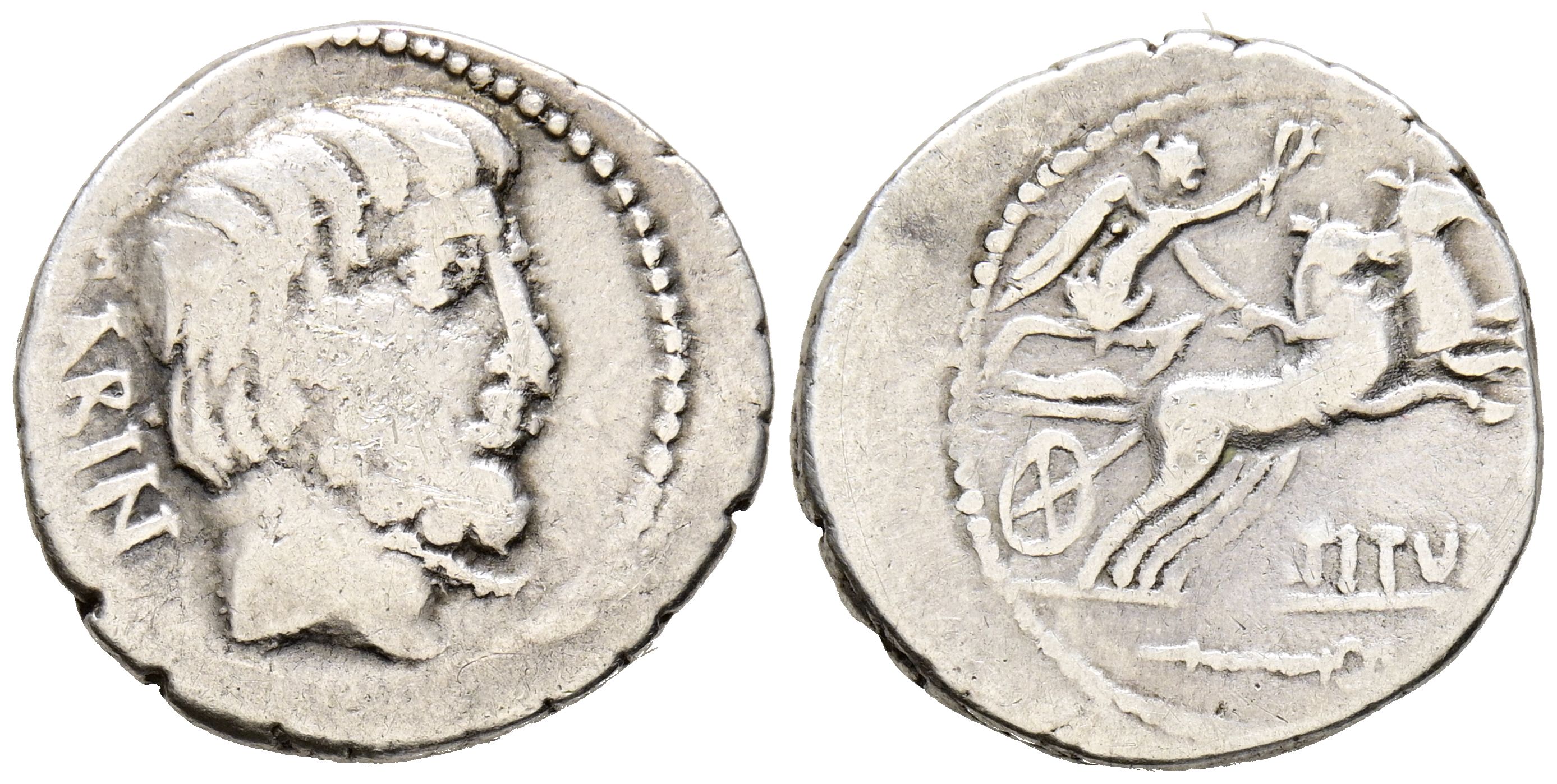 GENS TITURIA. Denario. (Ar. 3,70g/18mm). 89 a.C. Roma. (FFC 1147; Crawford 344/3). Anv: Cabeza de Tatius a derecha, dertás leyenda: SABIN. Rev: Victoria conduciendo biga a derecha con corona de laurel, debajo leyenda: L TITVRI, en exergo: caduceo. MBC-.