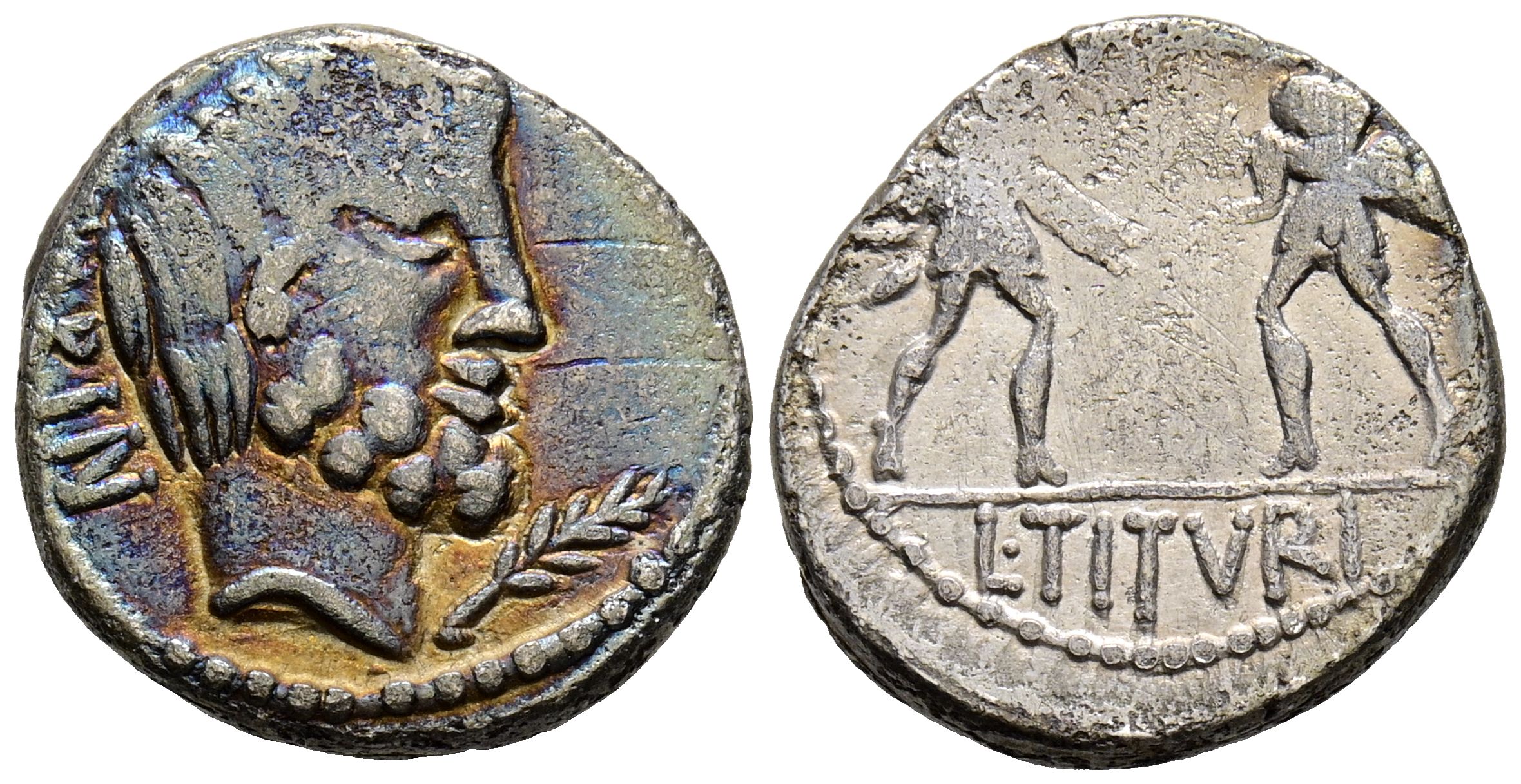GENS TITURIA. Denario. (Ar. 3,59g/17mm). 89 a.C. Roma. (FFC 1154; Crawford 344/1b). Anv: Cabeza de Tatius a derecha, delante palma, detrás leyenda: SABIN. Rev: Dos guerreros con dos sabinas en sus brazos, en exergo: L TITVRI. MBC. Preciosa pátina irisada.