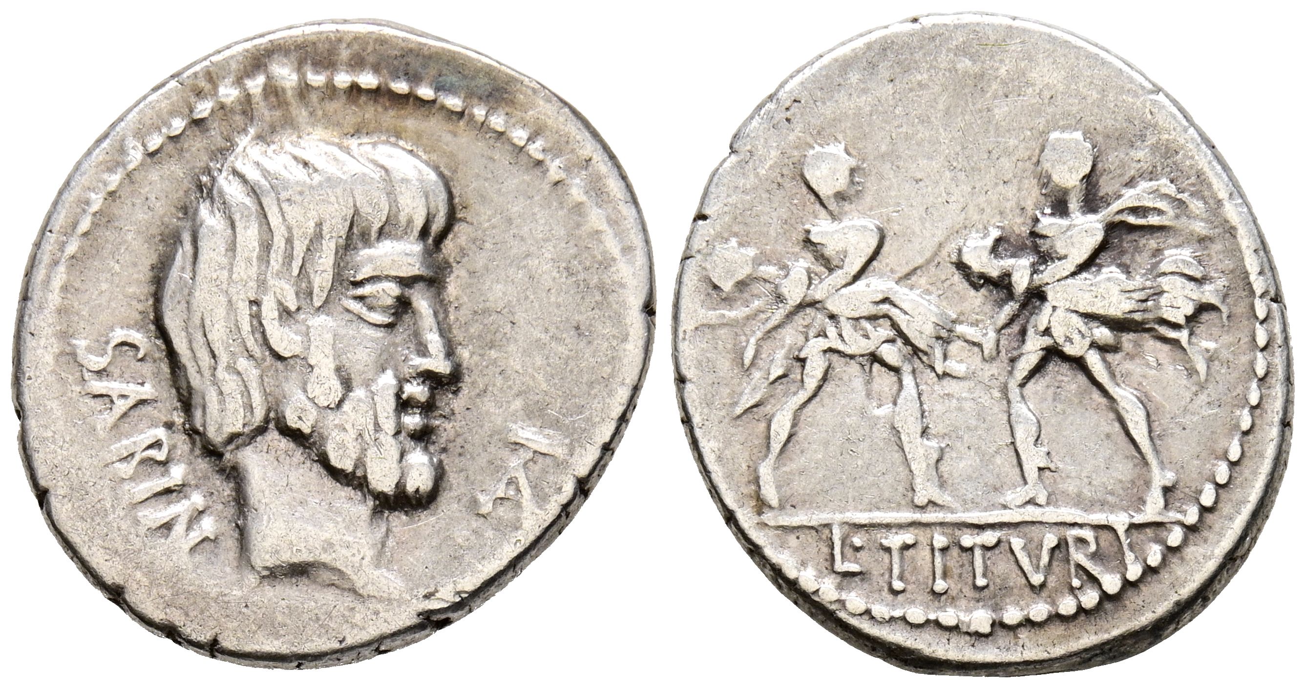GENS TITURIA. Denario. (Ar. 3,98g/20mm). 89 a.C. Roma. Anv: Cabeza del rey Tatius a derecha, delante monograma: TA, detrás leyenda: SABIN. Rev: Dos guerreros romanos con sabinas en sus brazos a izquierda, en exergo: L TITVRI. MBC.