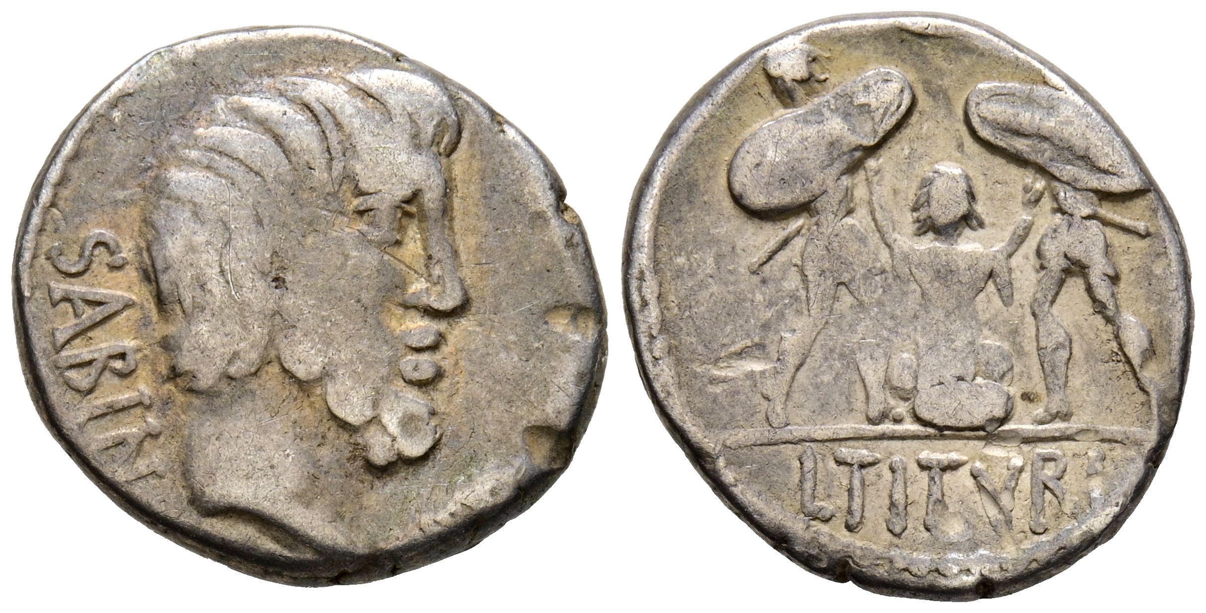 GENS TITURIA. Denario. (Ar. 3,74g/17mm). 89 a.C. Roma. (FFC 1156; Crawford 344/2b). Anv: Cabeza de Tatius a derecha, delante palma, detrás leyenda: SABIN. Rev: Tarpeia arrodillada sobre escudo intentando separar a dos soldados que la están golpeando, encima estrella y creciente, en exergo: L TITVRI. MBC-.