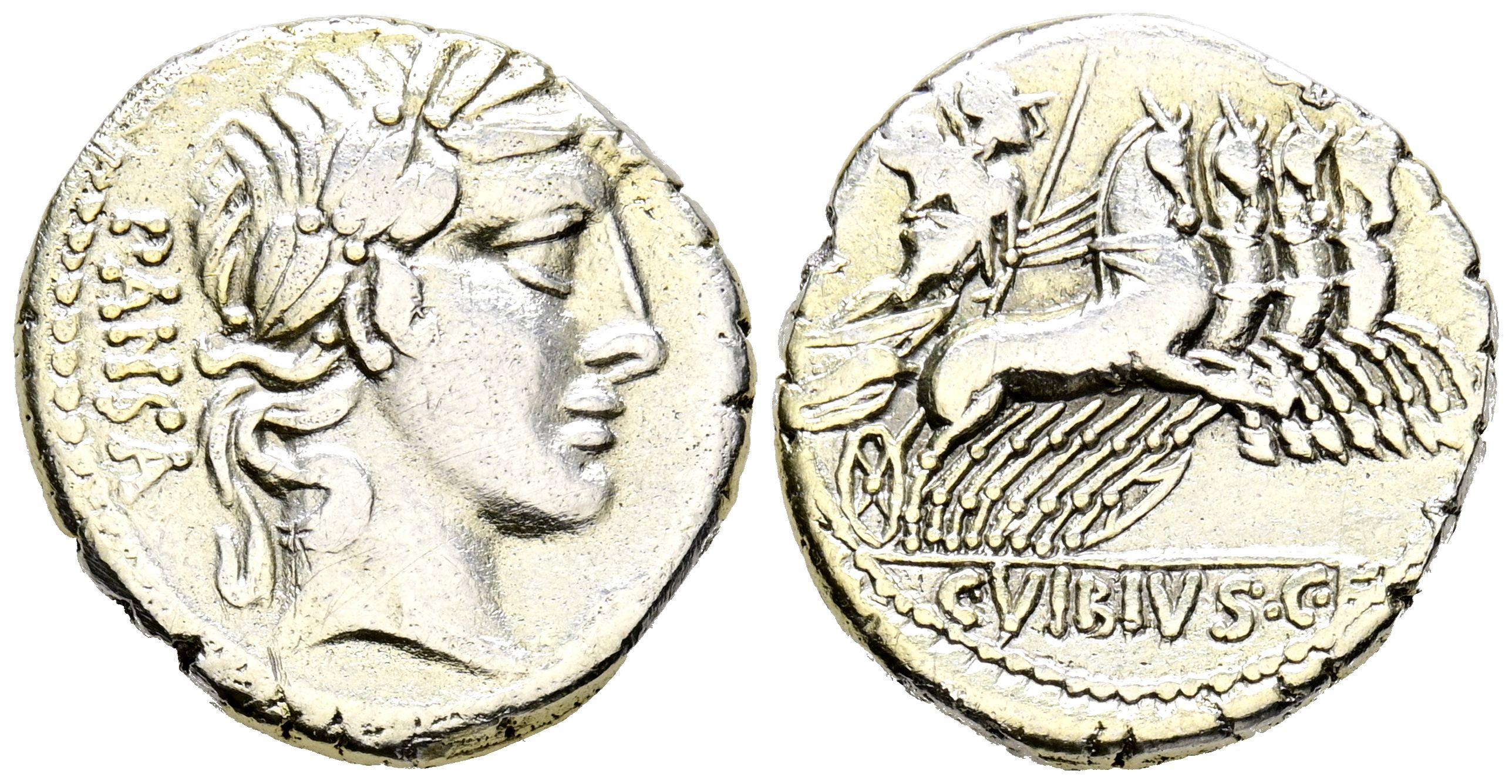 GENS VIBIA. Denario. (Ar. 3,74g/19mm). 90 a.C. Taller auxiliar de Roma. (FFC 1198; Crawford 342/5). Anv: Cabeza grande laureada de Apolo a derecha, detrás leyenda: PANSA. Rev: Minerva con cetro y trofeo conduciendo cuádriga a derecha, en exergo: C VIBIVS CF. MBC.