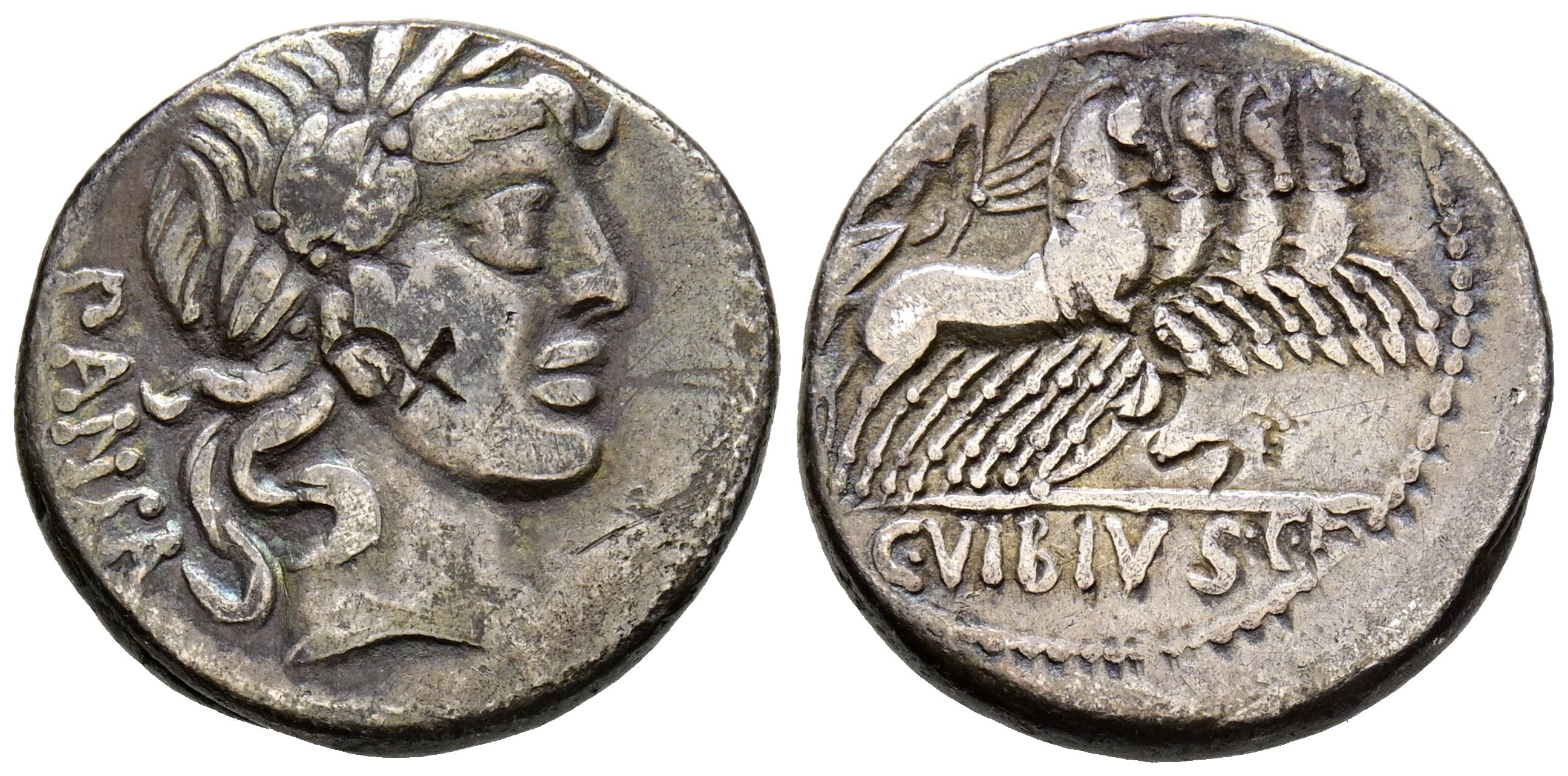 GENS VIBIA. Denario. (Ar. 3,74g/18mm). 90 a.C. Taller auxiliar de Roma. (FFC 1198; Crawford 342/5). Anv: Cabeza laureada de Apolo a derecha con grandes rizos en la nuca, detrás leyenda: PANSA. Rev: Minerva con cetro y trofeo conduciendo cuádriga a derecha, en exergo: C VIBIVS CF. MBC. Contramarcas.