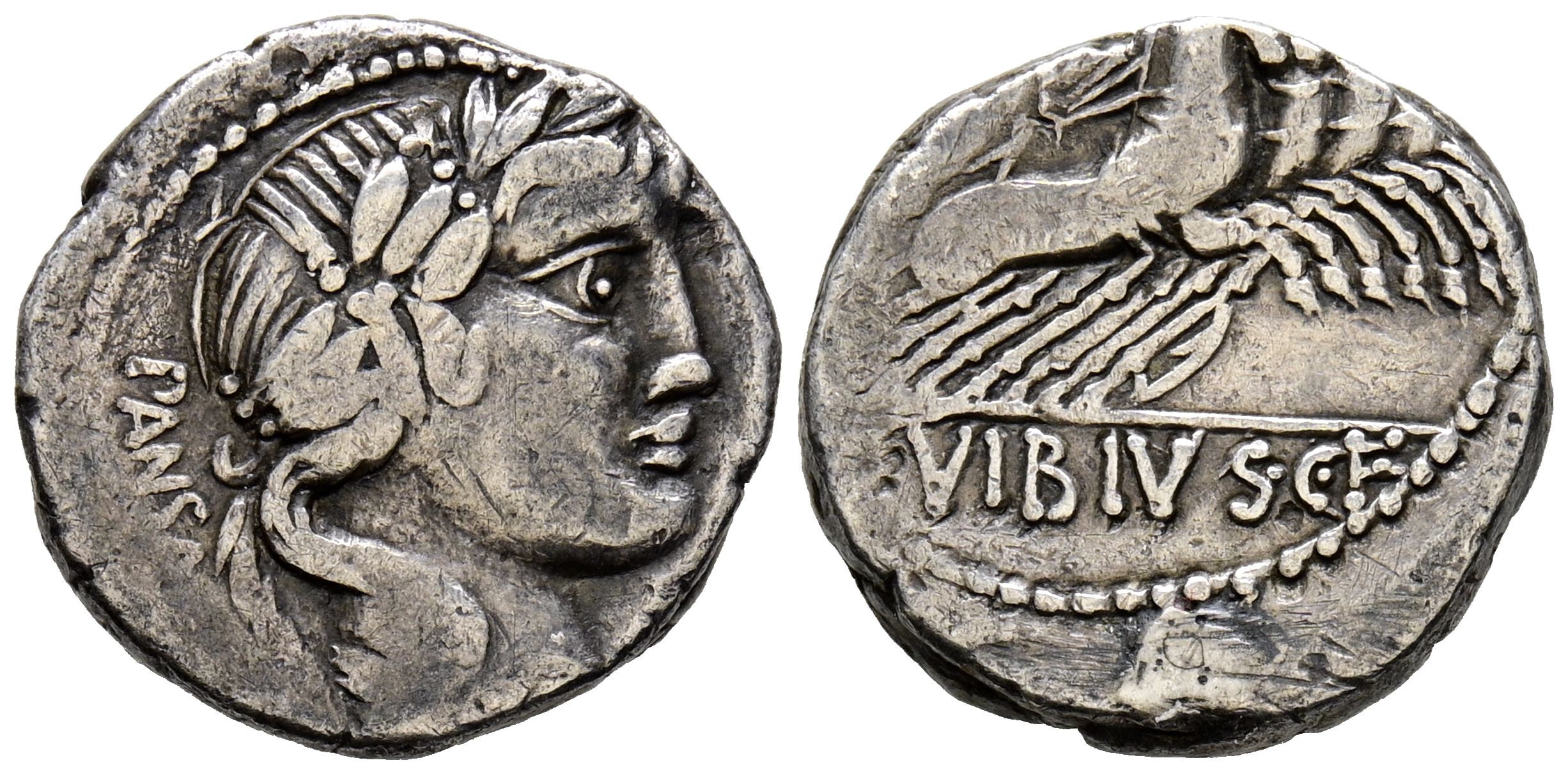 GENS VIBIA. Denario. (Ar. 4,03g/17mm). 90 a.C. Taller auxiliar de Roma. (FFC 1198; Crawford 342/5). Anv: Cabeza grande laureada de Apolo a derecha, detrás leyenda: PANSA. Rev: Minerva con cetro y trofeo conduciendo cuádriga a derecha, en exergo: C VIBIVS CF. MBC.