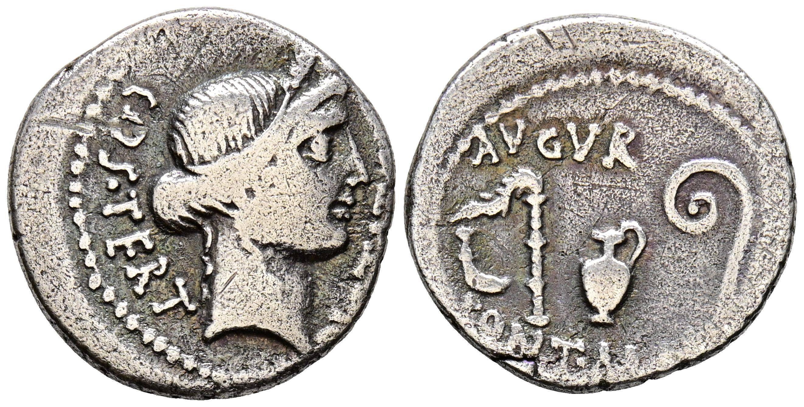 JULIO CESAR. Denario. (Ar. 3,34g/18mm). 46 a.C. Africa. (FFC 2; Crawford 467/1b). Anv: Cabeza de Ceres a derecha con corona de espigas, alrededor leyenda: COS TERT DICT ITER. Rev: Símpulo, aspersorio, praeferículo y lítuo, en campo: M, alrededor leyenda: AVGVR PONT MAX. MBC-. Escaso ejemplar.