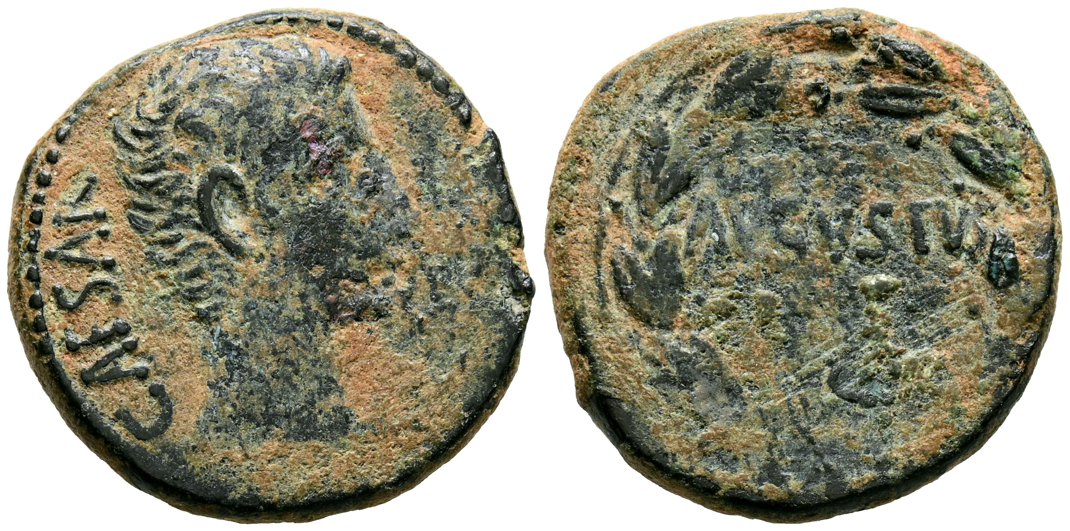 AUGUSTO. As. (Ae. 8,49g/24mm). 27 a.C.-14 d.C. Antioquia. (RPC 4100). Anv: Cabeza desnuda de Augusto a derecha, detrás: CAESAR. Rev: Inscripción AVGVSTVS en una línea dentro de corona de laurel. MBC.