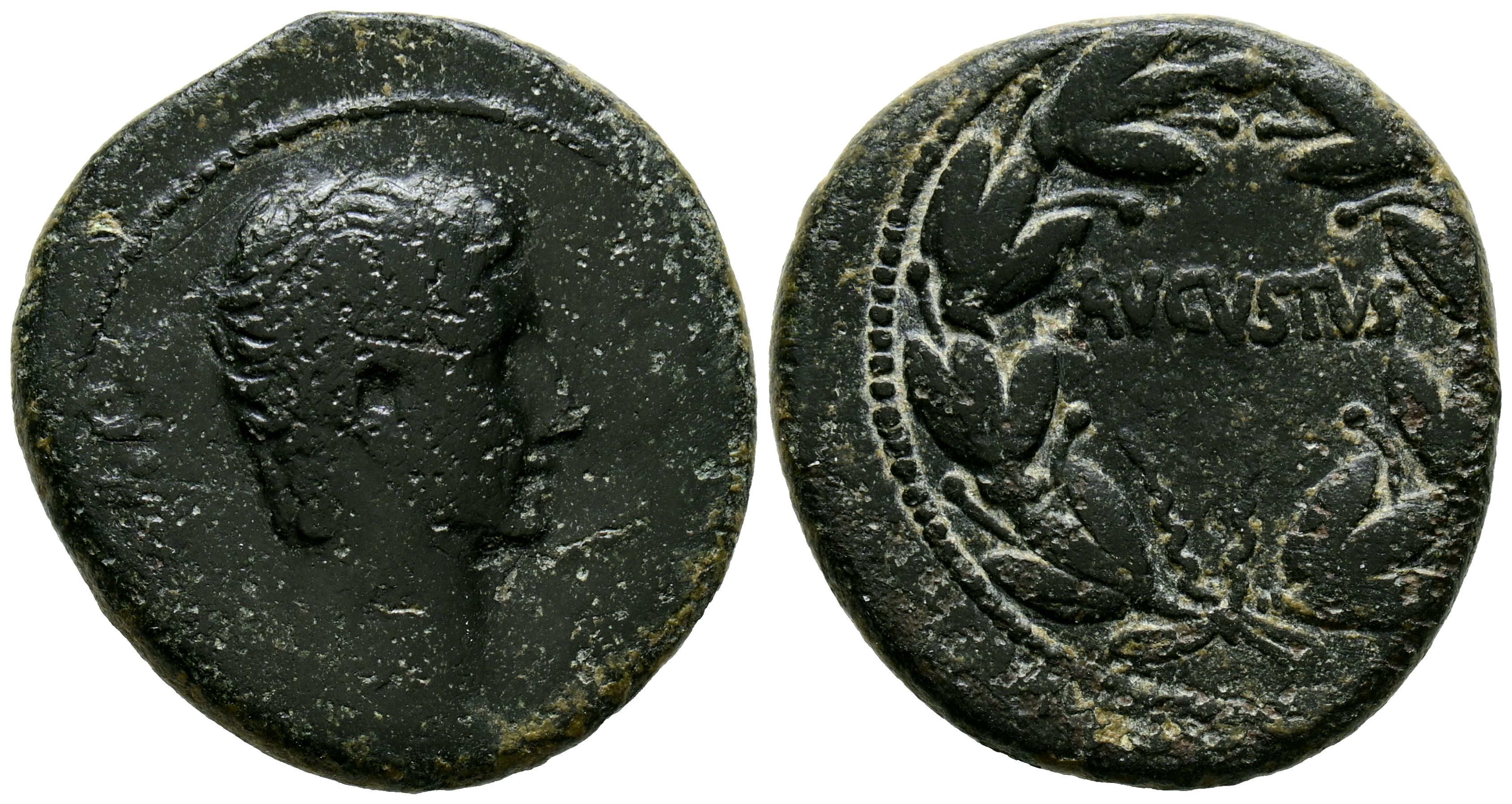 AUGUSTO. As. (Ae. 10,56g/25mm). 27 a.C.-14 d.C. Antioquía. (RPC 4100). Anv: Cabeza desnuda de Augusto a derecha, detrás: CAESAR. Rev: Inscripción AVGVSTVS en una línea dentro de corona de laurel. MBC-.