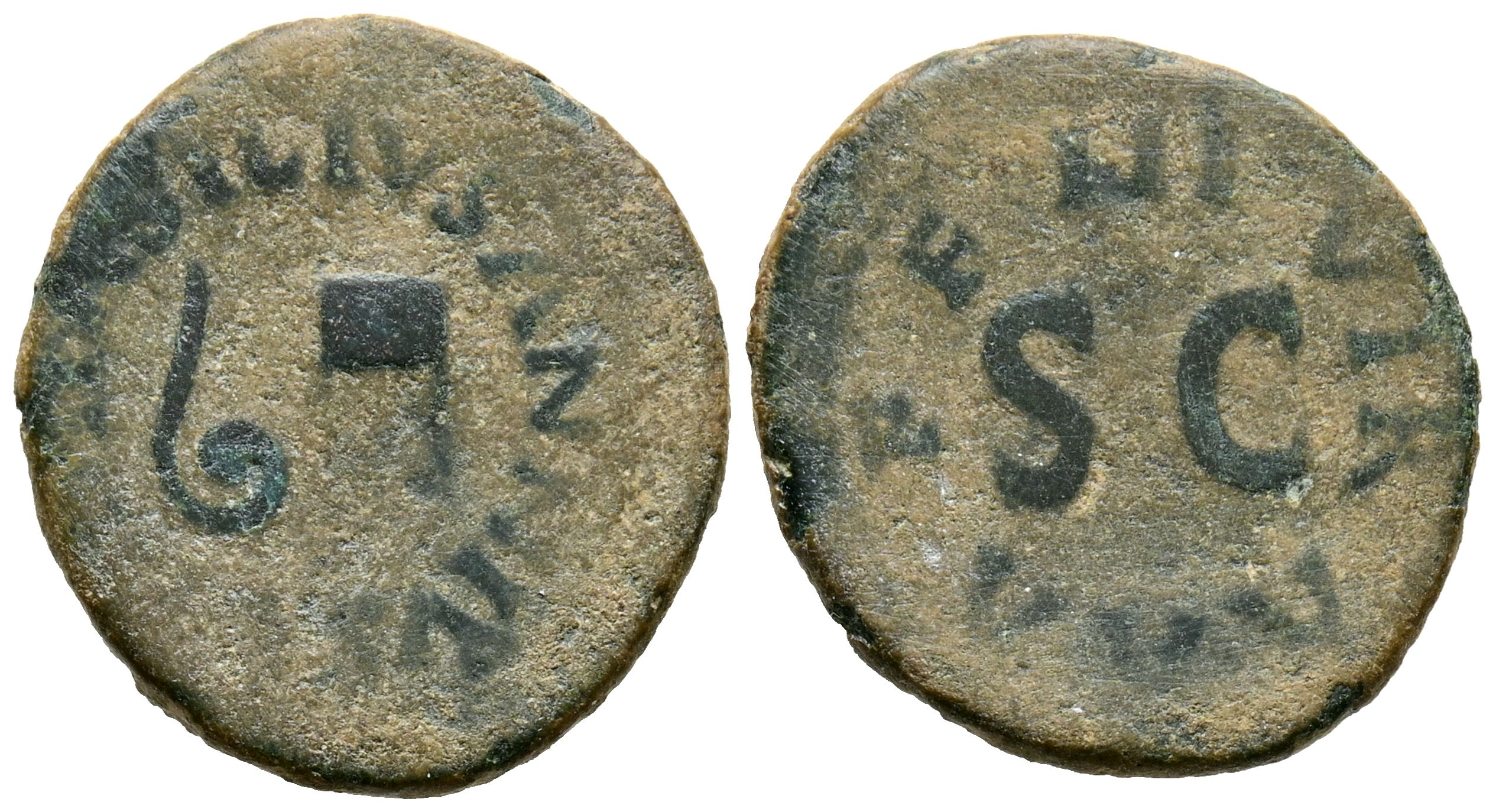 AUGUSTO. Cuadrante. (Ae. 2,96g/19mm). 9 a.C. Roma. (RIC 421). Anv: Simpulum y lituus, alrededor leyenda: LAMIA SILIVS ANNIV. Rev: SC, alrededor leyenda: III VIR AAA F F. MBC.