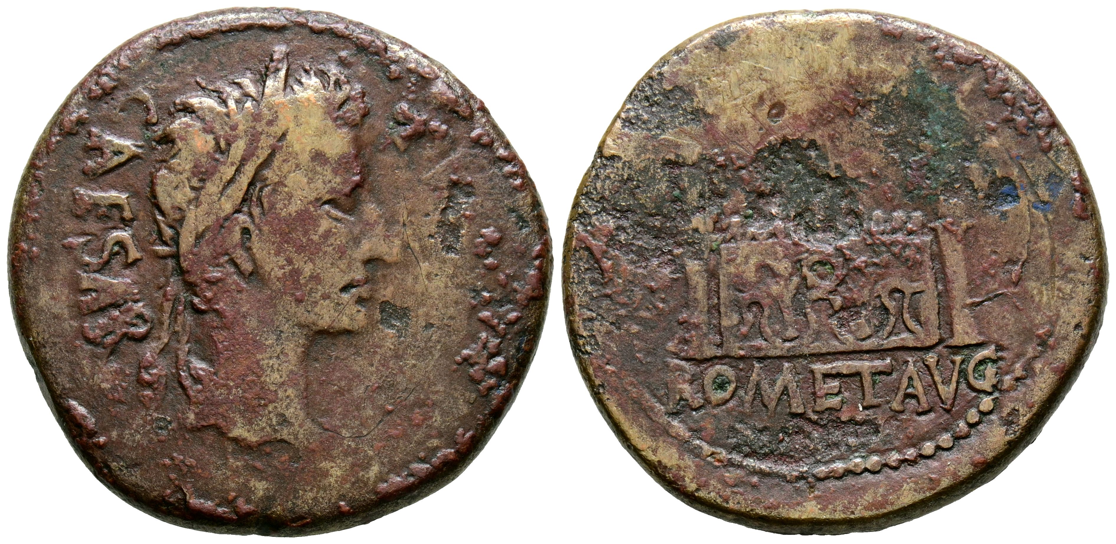 AUGUSTO. As. (Ae. 10,35g/26mm). 10-7 a.C. Lugdunum. (RIC 230). Anv: Cabeza laureada de Augusto a derecha, alrededor leyenda: CAESAR PONT MAX. Rev: Frontal del altar de Lugdunum decorado con corona cívica entre laureles, flanqueado por dos figuras masculinas desnudas, Victorias enfrentadas sobre las columnas, alrededor leyenda: ROM ET AVG. MBC.