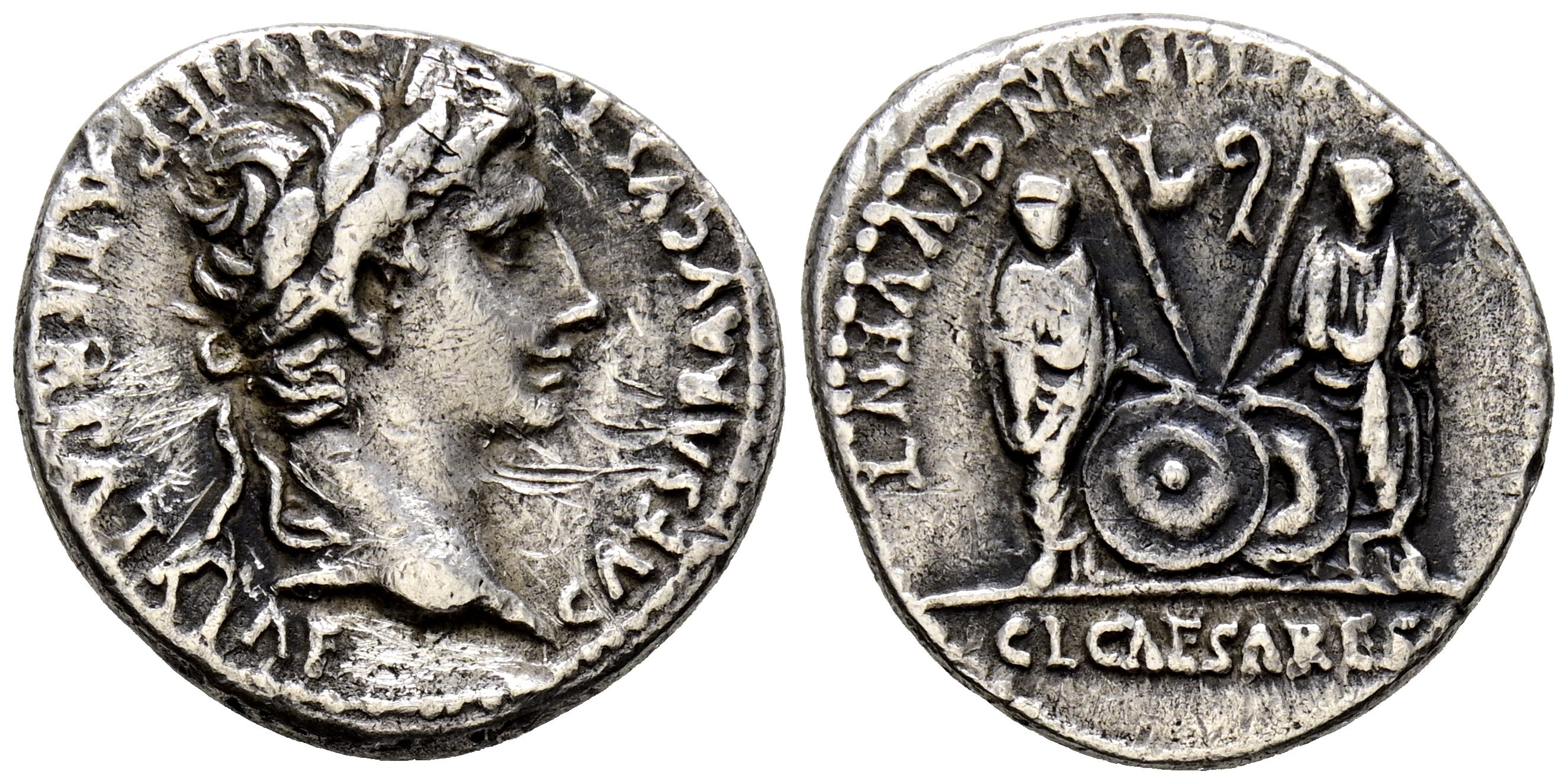 AUGUSTO. Denario. (Ar. 3,74g/19mm). 7-6 a.C. (RIC 207). Anv: Cabeza laureada de Augusto a derecha, alrededor leyenda: CAESAR AVGVSTVS DIVI F PATER PATRIAE. Rev: Cayo y Lucio estantes de frente, entre ellos escudo y lanzas, en campo símpulo y lítuo, en exergo: CL CAESARES, alrededor leyenda: AVGVSTI F COS DESIG PRINC IVVENT. MBC. Limpiado.