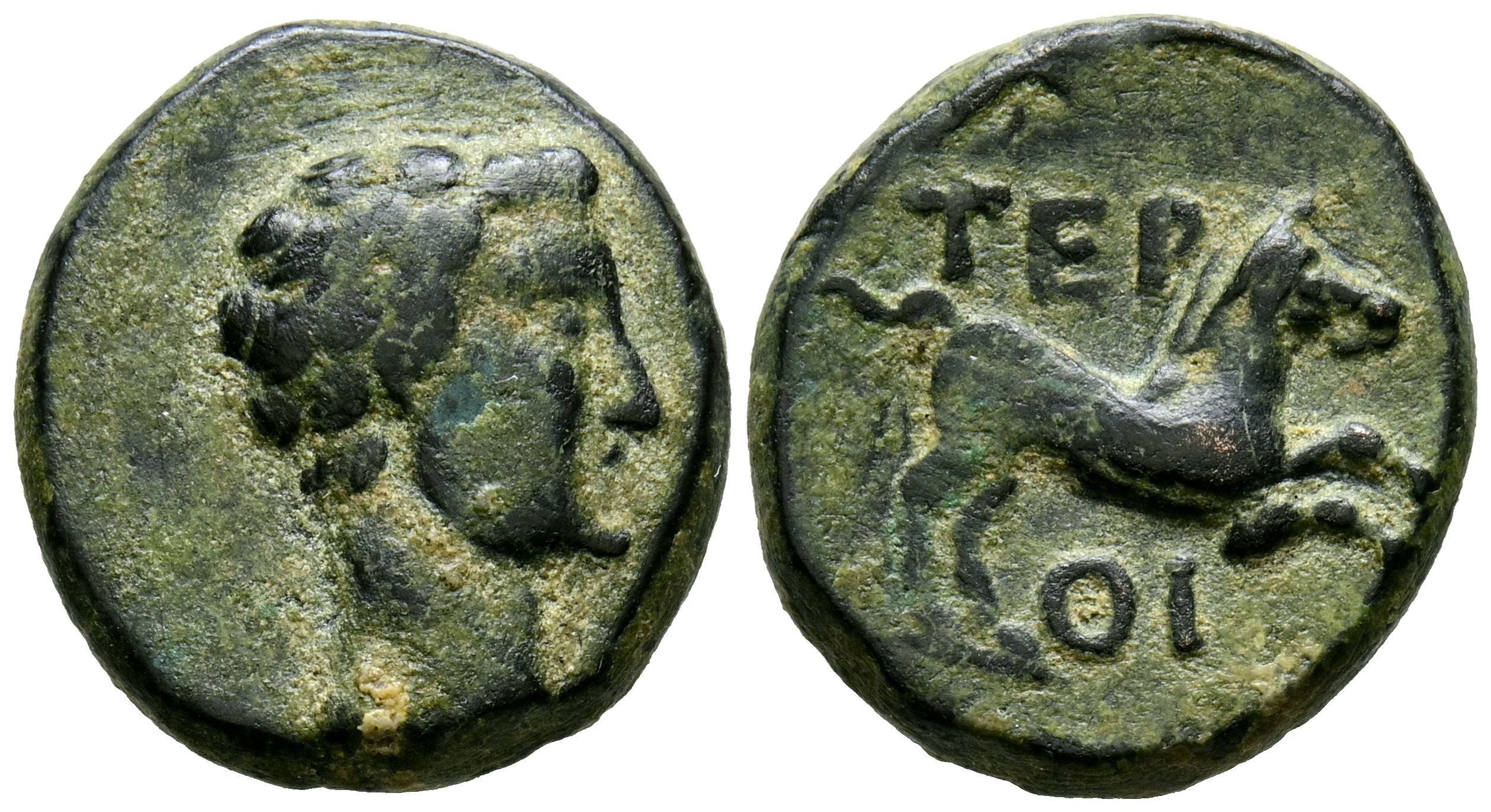 TIBERIO. Ae19. (Ae. 5,90g/19mm). 14-37 d.C. Pisidia, Termessos. (RPC 3360). Anv: Cabeza desnuda de Tiberia a derecha. Rev: Caballo galopando a derecha, encima: TEP, debajo: OI. MBC.