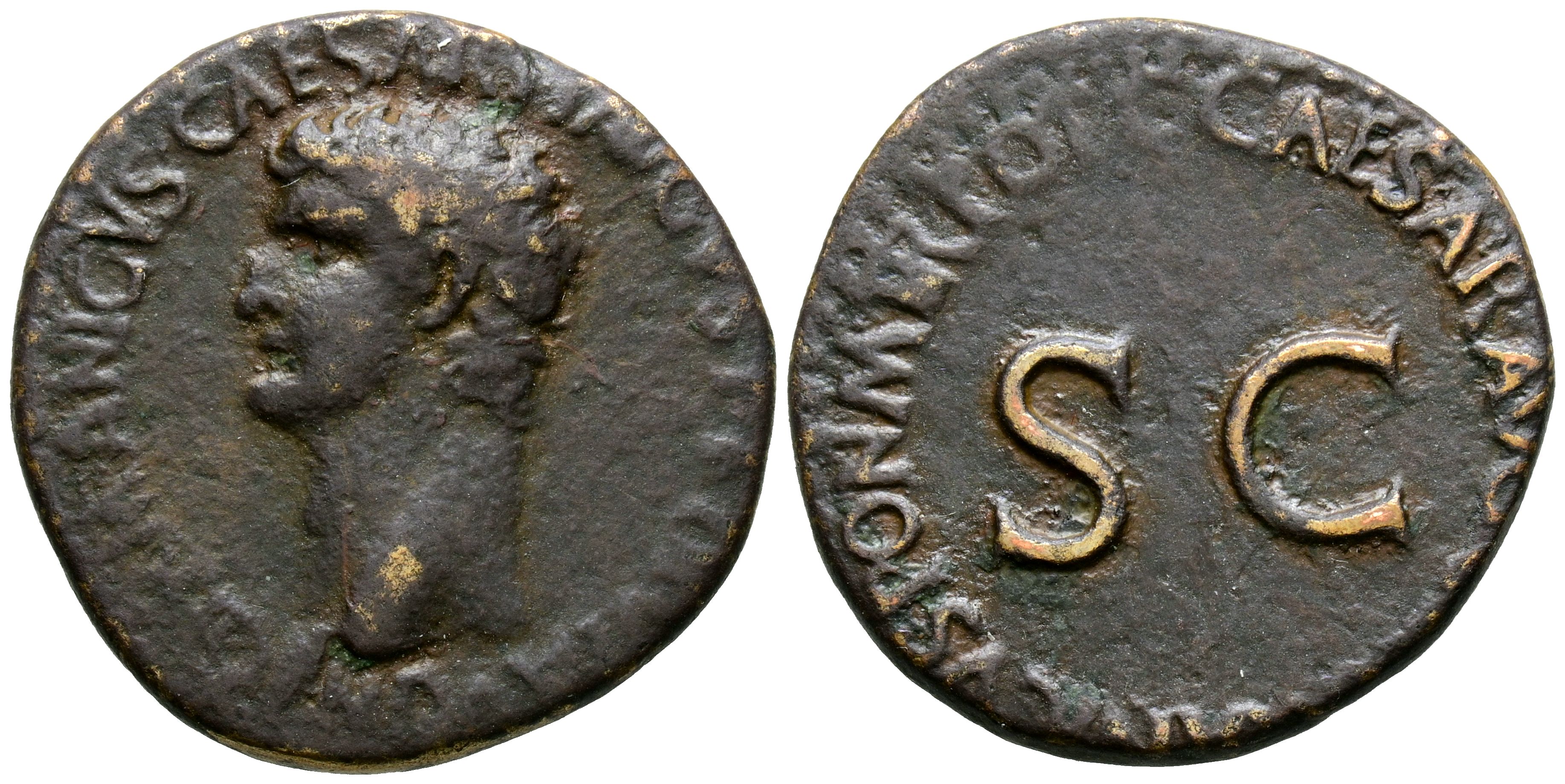 CALIGULA. As. (Ae. 8,67g/26mm). 37-38 d.C. Roma. (RIC 35). Anv: Cabeza de Calígula a derecha, alrededor leyenda: GERMANICVS CAESAR TI AVGVST F DIVI AVG N. Rev: SC, alrededor leyenda: C CAESAR AVG GERMANICVS PON M TR POT. MBC.