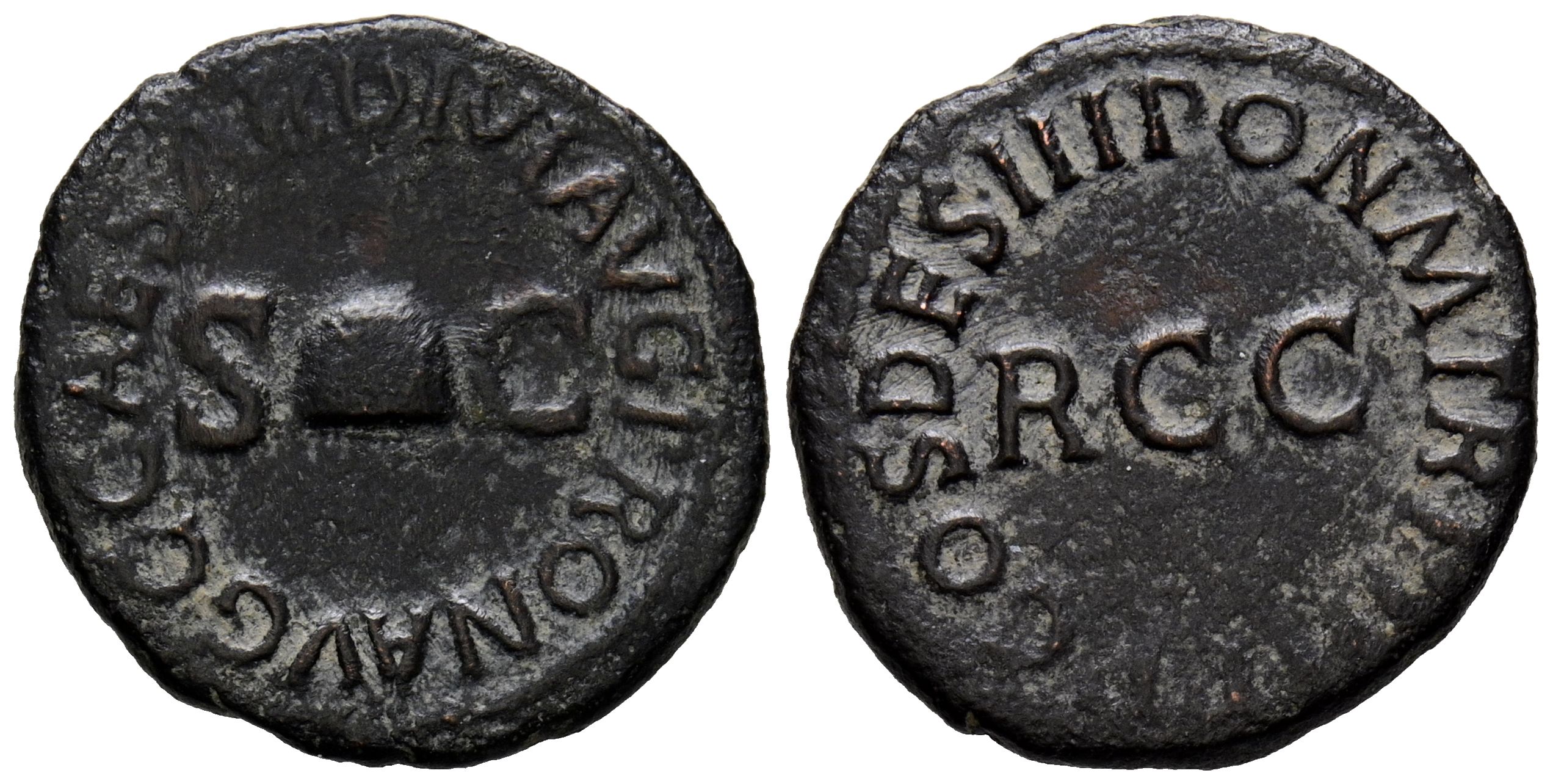 CALIGULA. Cuadrante. (Ae. 2,58g/18mm). 40-41 d.C. Roma. (RIC 52). Anv: Píleo, entre: S-C, alrededor leyenda: C CAESAR DIVI AVG PRON AVG. Rev: RCC, alrededor leyenda: PON M TR P IIII P P TERT. MBC.