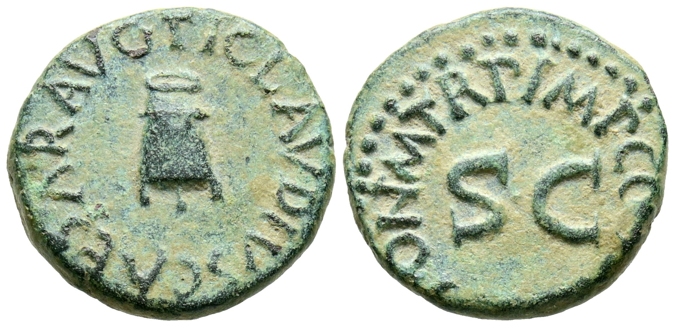 CLAUDIO I. Cuadrante. (Ae. 3,00g/16mm). 41 d.C. Roma. (RIC 84). Anv: Modio, alrededor leyenda: TI CLAVDIVS CAESAR AVG. Rev: SC, alrededor leyenda: PON M TR P IMP COS II. MBC+.