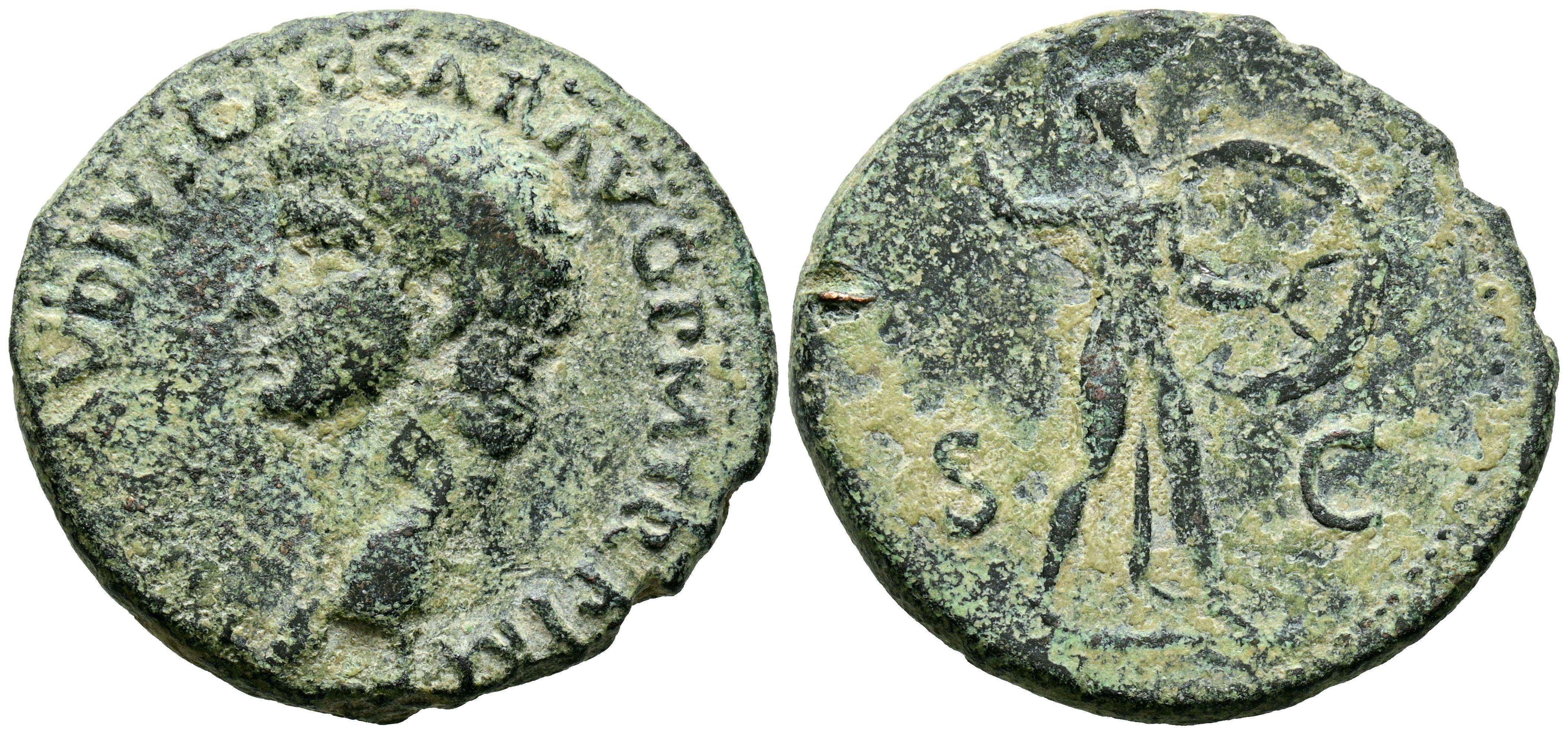 CLAUDIO I. As. (Ae. 12,83g/29mm). 41-50 d.C. Roma. (RIC 100). Anv: Cabeza de Claudio I a izquierda, alrededor leyenda: TI CLAVDIVS CAESAR AVG P M TR P IMP. Rev: Minerva avanzando a derecha portando lanza y escudo, entre S-C. MBC.
