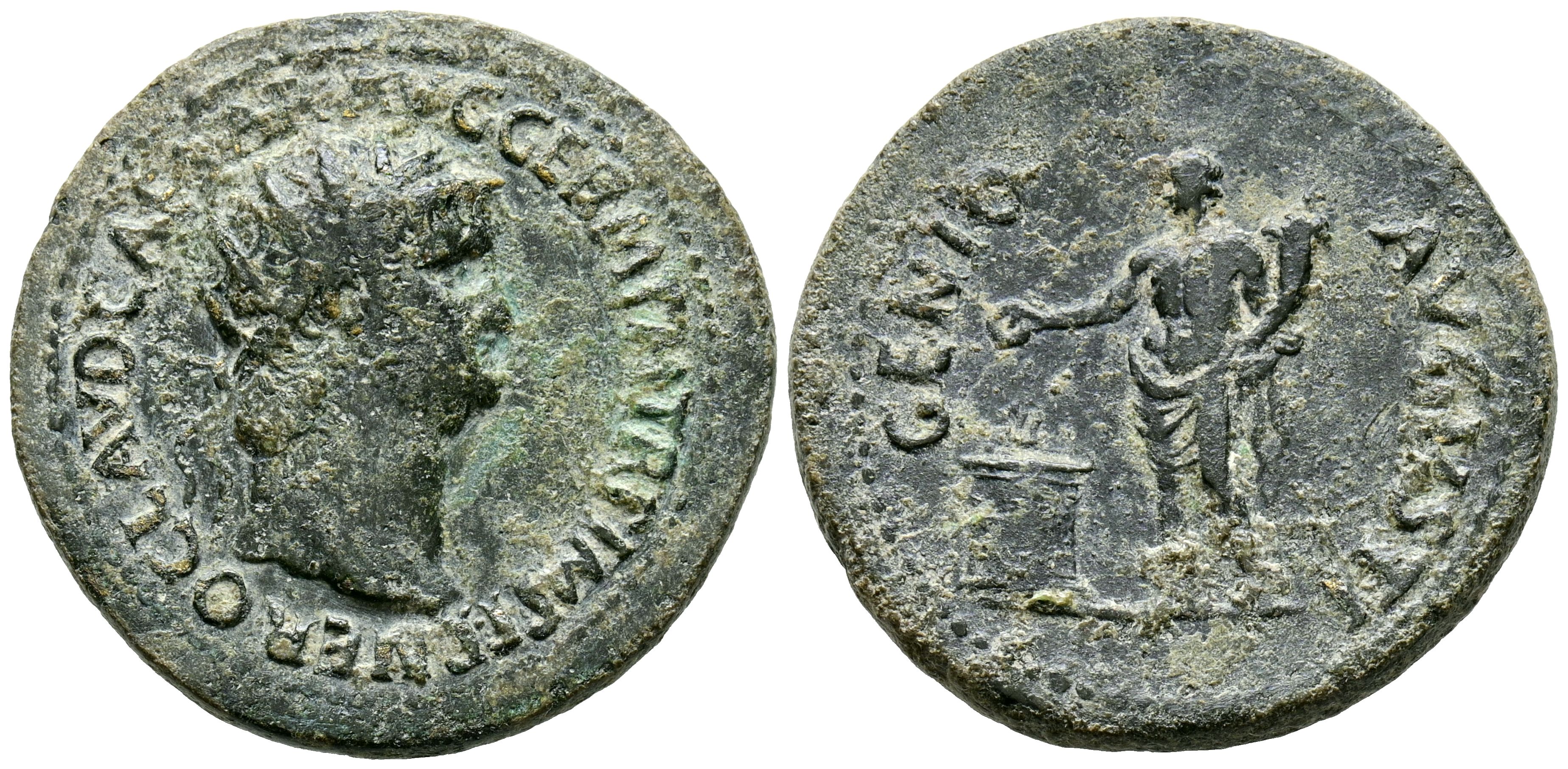 NERON. Dupondio. (Ae. 7,77g/25mm). 64 d.C. Roma. (RIC 124). Anv: Busto radiado a derecha de Nerón, alrededor leyenda: NERO CLAVD CAESAR AVG GER P M TR P IMP P P. Rev: Genio estante a izquierda portando cornucopia y patera sobre altar, alrededor leyenda: GENIO AVGVSTI. MBC/MBC+.