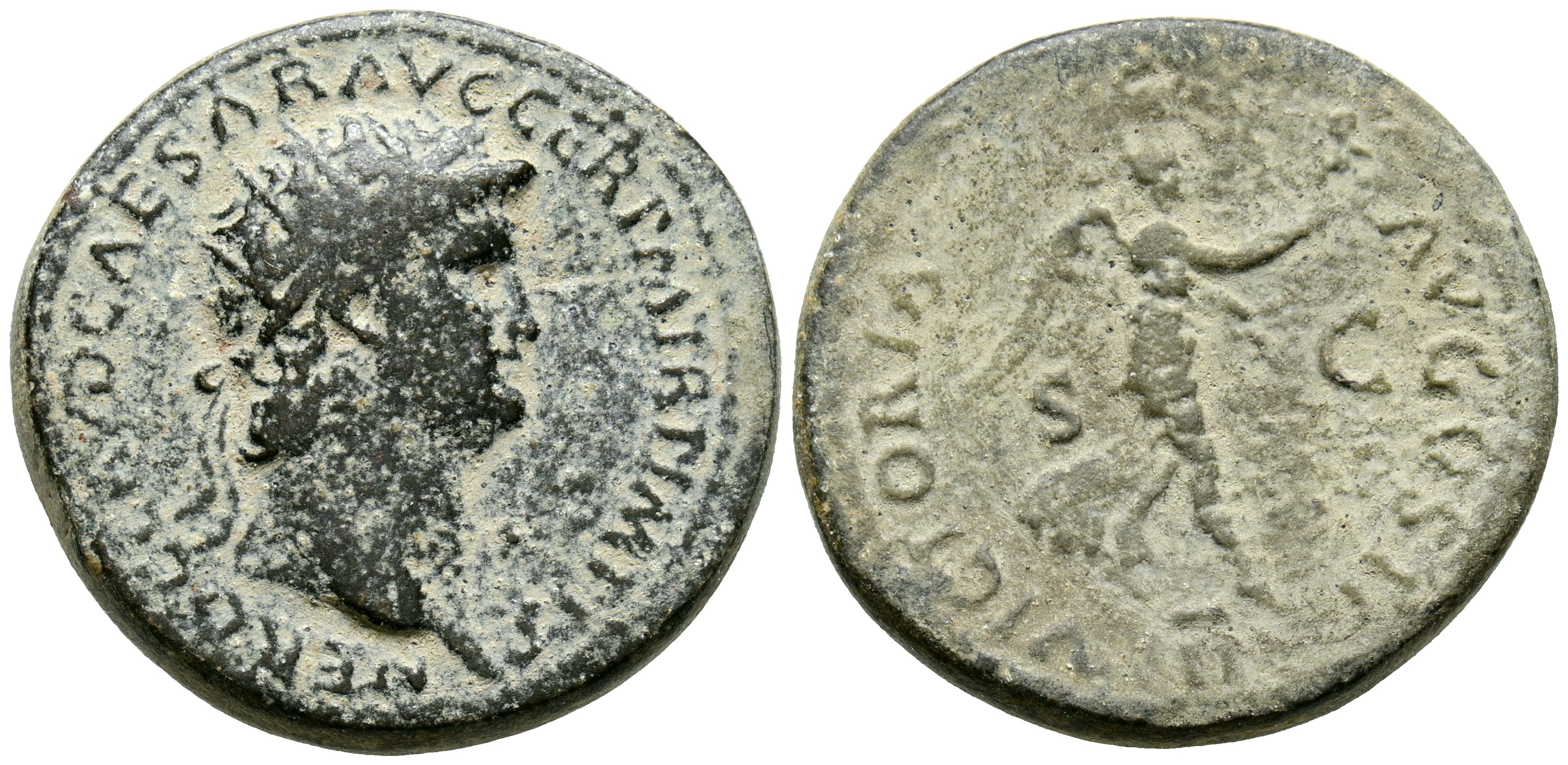NERÓN. Dupondio. (Ae. 8,99g/27mm). 64 d.C. Roma. (RIC 202). Anv: Busto radiado de Nerón a derecha, alrededor leyenda: NERO CLAVD CAESAR AVG GER P M TR P IMP P P. Rev: Victoria avanzando a derecha portando corona de laurel y palma, entre S-C, en exergo: II, alrededor leyenda: VICTORIA AVGVSTI. MBC. Campos repasados.