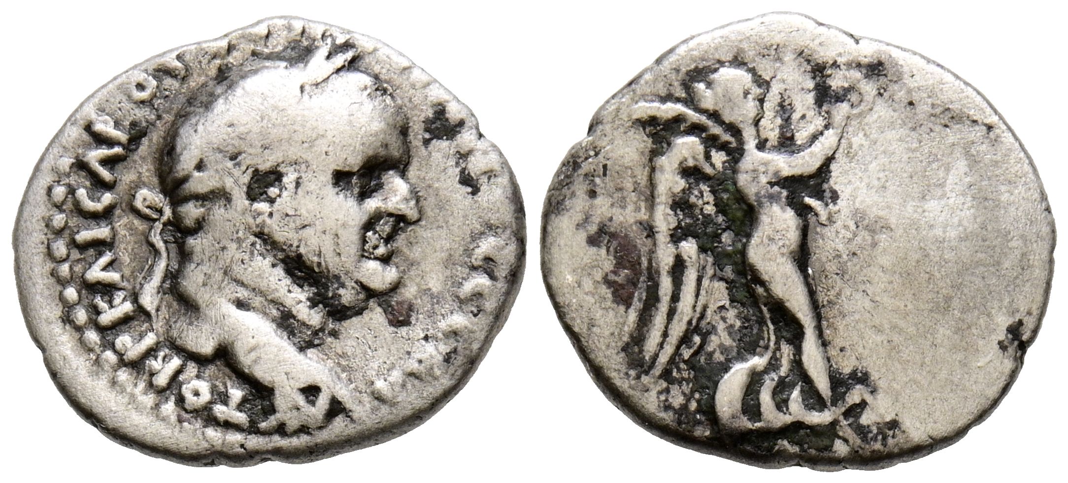 VESPASIANO. Hemidracma. (Ar. 1,66g/15mm). 69-79 d.C. Capadocia, Cesarea-Eusebia. (RPC 1659). Anv: Cabeza laureada de Vespasiano a derecha, alrededor leyenda: AVTOKP KAICAP OVЄCΠACIANOC CЄBA. Rev: Victoria avanzando a derecha con corona de laurel. MBC.