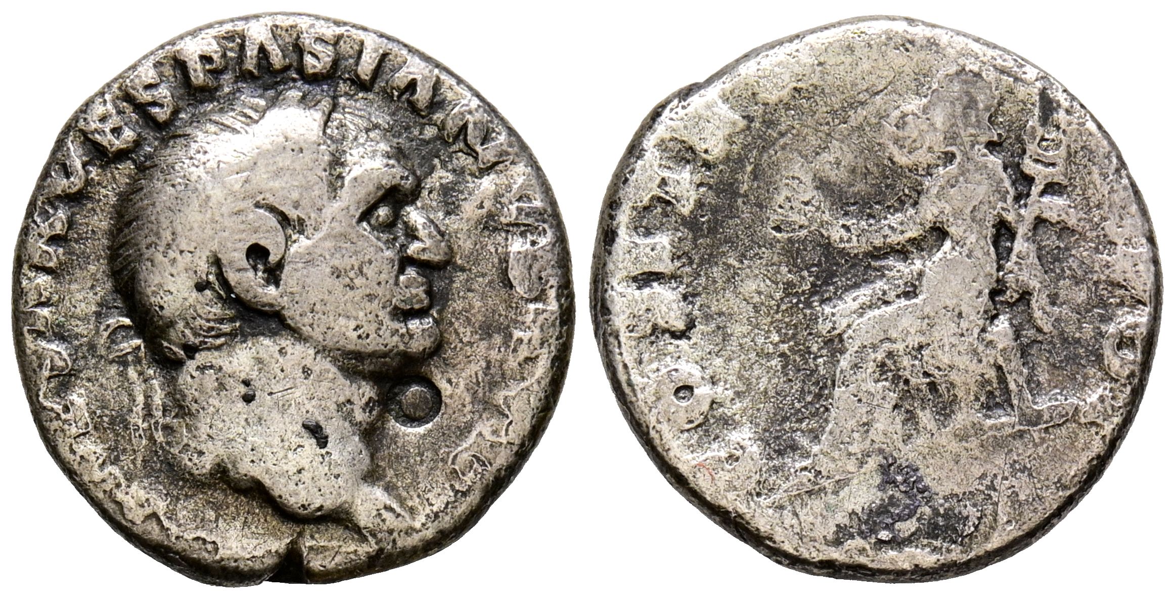 VESPASIANO. Denario. (Ar. 3,03g/16mm). 70 d.C. Roma. Anv: Busto laureado de Vespasiano a derecha, alrededor leyenda: IMP CAESAR VESPASIANVS AVG. Rev: Pax sentada a izquierda con rama de olivo y caduceo, alrededor leyenda: COS ITER TR POT. BC+.
