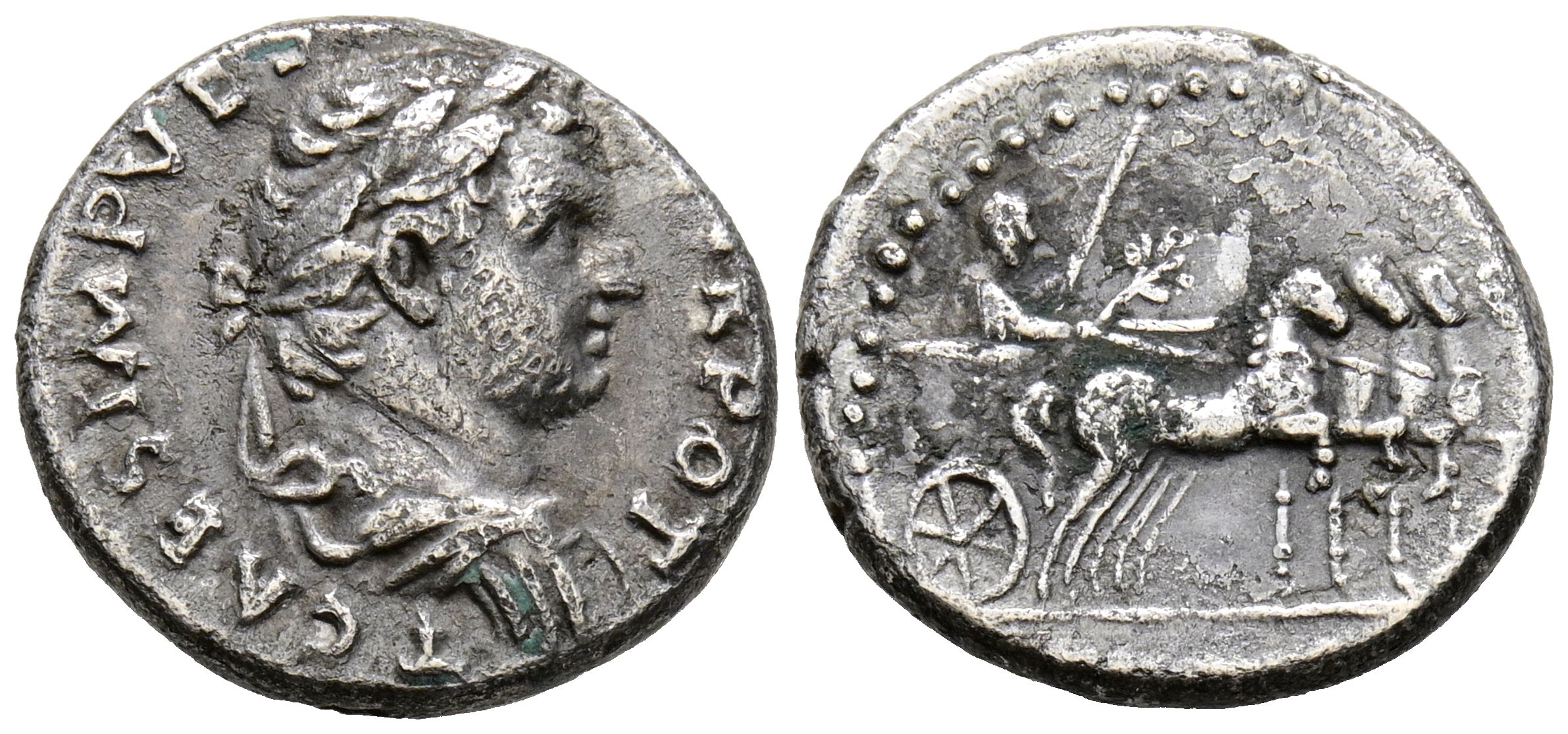 TITO, Acuñación conmemorativa a "Judaea Capta". Denario. (Ar. 3,58/16mm). 72-73 d.C. Antioquía. (RIC 1563). Anv: Busto laureado y drapeado de Tito a derecha, alrederdor leyenda: T CAES IMP VESP PON TR POT. Rev: Tito conduciendo cuádriga a derecha portando rama y cetro. MBC.