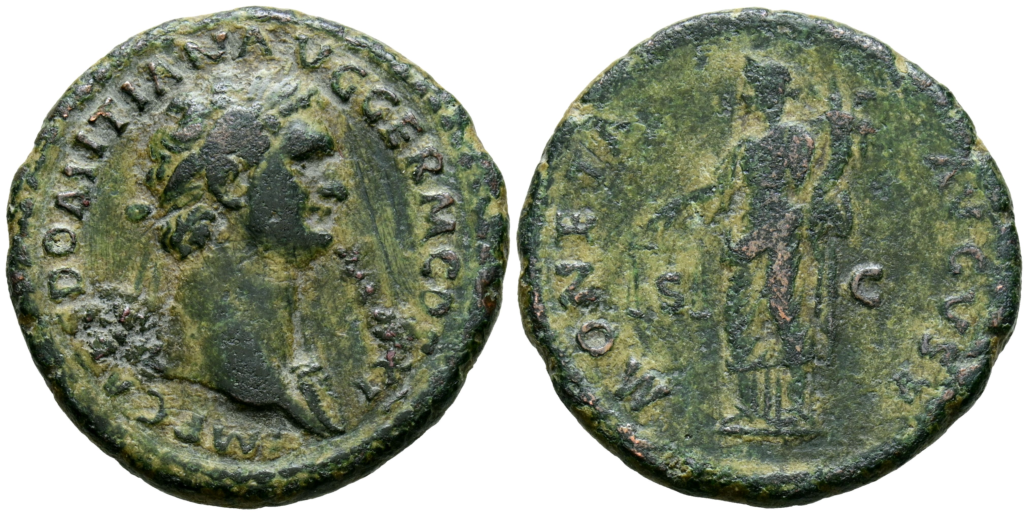 DOMICIANO. As. (Ae. 11,92g/28mm). 85 d.C. Roma. (RIC 303). Anv: Busto laureado de Domiciano a derecha, alrededor leyenda: IMP DOMITIAN AVG GER M COS XI. Rev: Moneta estante a derecha sosteniendo escalas y cornucopia, entre S-C, alrededor leyenda: MONETA AVGVSTI. MBC-.