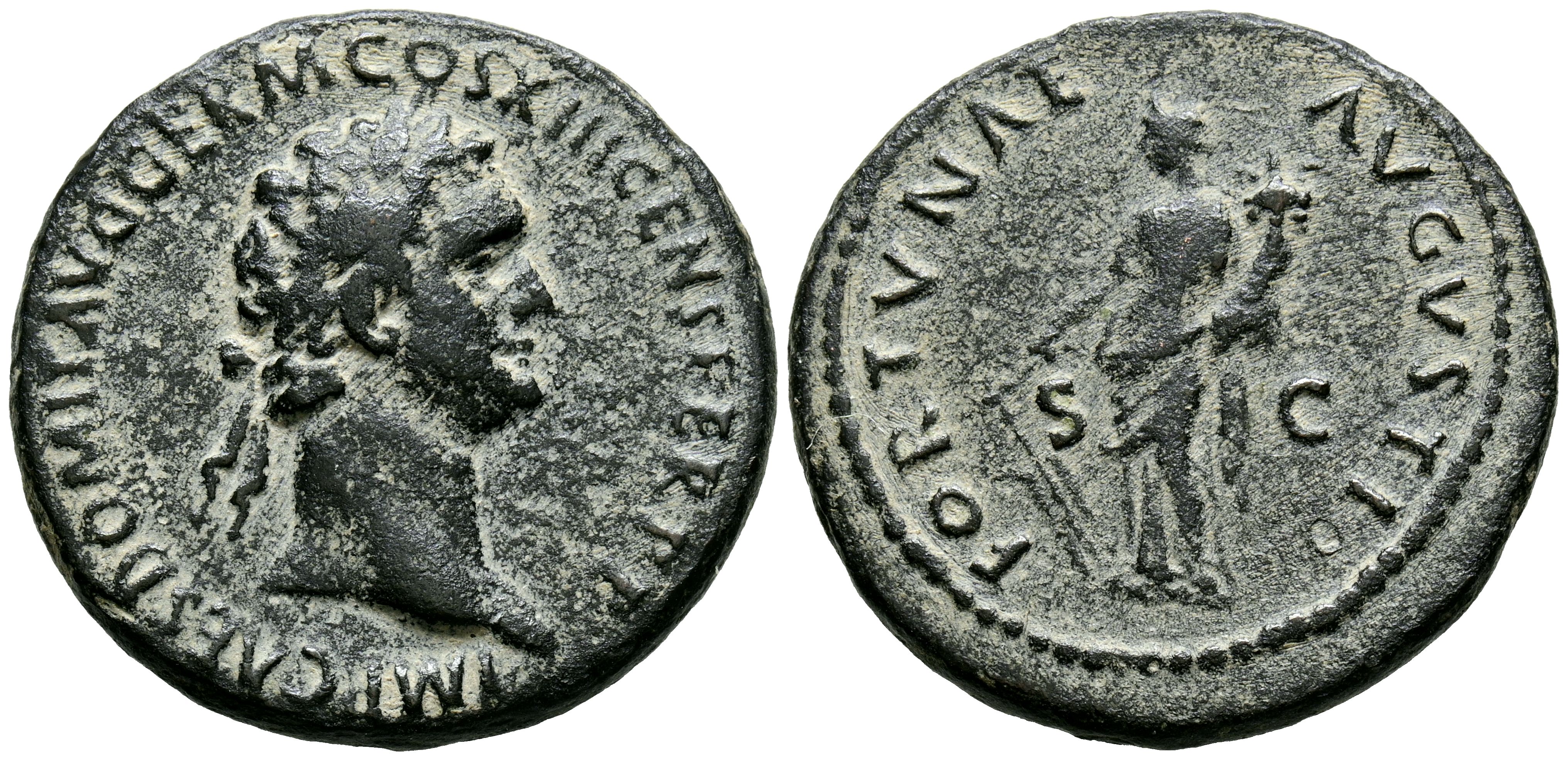 DOMICIANO. As. (Ae. 11,42g/28mm). 87 d.C. Roma. (RIC 544). Anv: Busto laureado de Domiciano a derecha, alrededor leyenda: IMP CAES DOMIT AVG GERM COS XIII CENS PER P P. Rev: Fortuna estante a derecha sosteniendo timón y cornucopia, alrededor leyenda: FORTVNAE AVGVGSTI. MBC. Campos repasados.