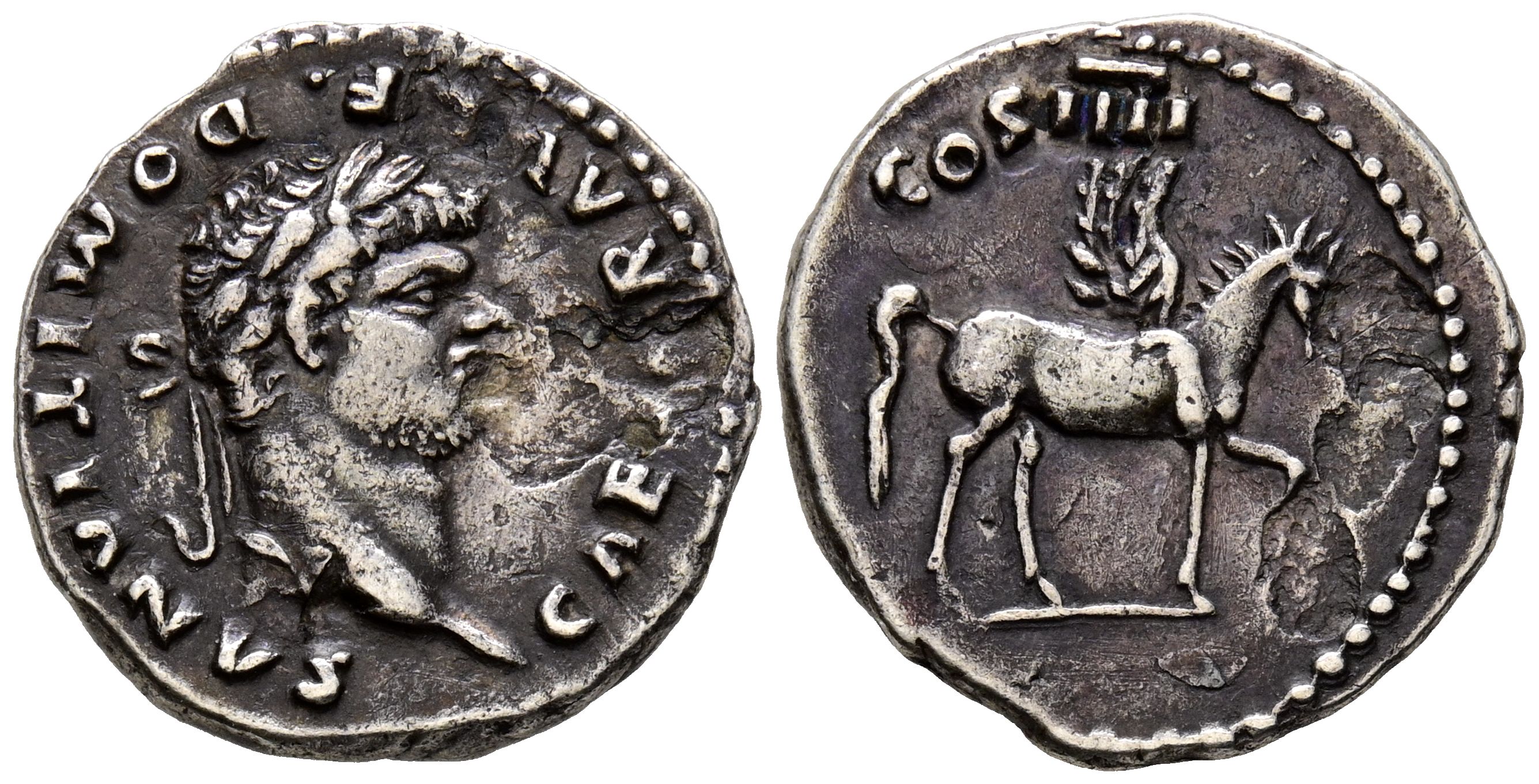 DOMICIANO. Denario. (Ar. 3,25g/19mm). 76-77 d.C. Roma. (RIC 921). Anv: CAESAR AVG F DOMITIANVS. Busto laureado a derecha de Domiciano. Rev: Pegaso a derecha, encima: COS IIII. MBC. Ligera tono.