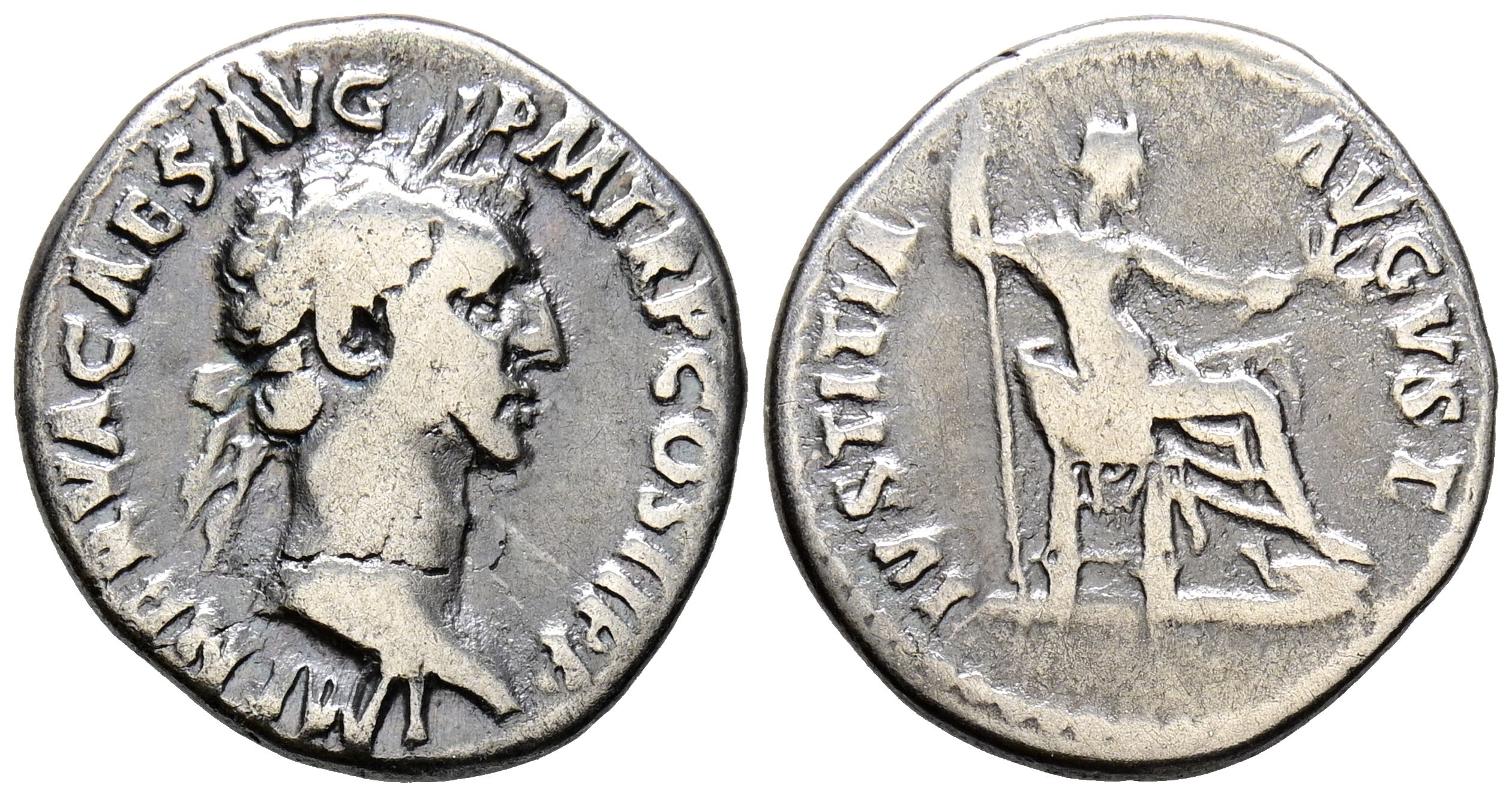 NERVA. Denario. (Ar. 3,02g/19mm). 97 a.C. Roma. (RIC 18). Anv: Cabeza laureada de Nerva a derecha, alrededor leyenda: IMP NERVA CAES AVG P M TR P COS II P P. Rev: Justitia sentada a derecha portando rama y cetro, alrededor leyenda: IVSTITIA AVGVST. MBC-.