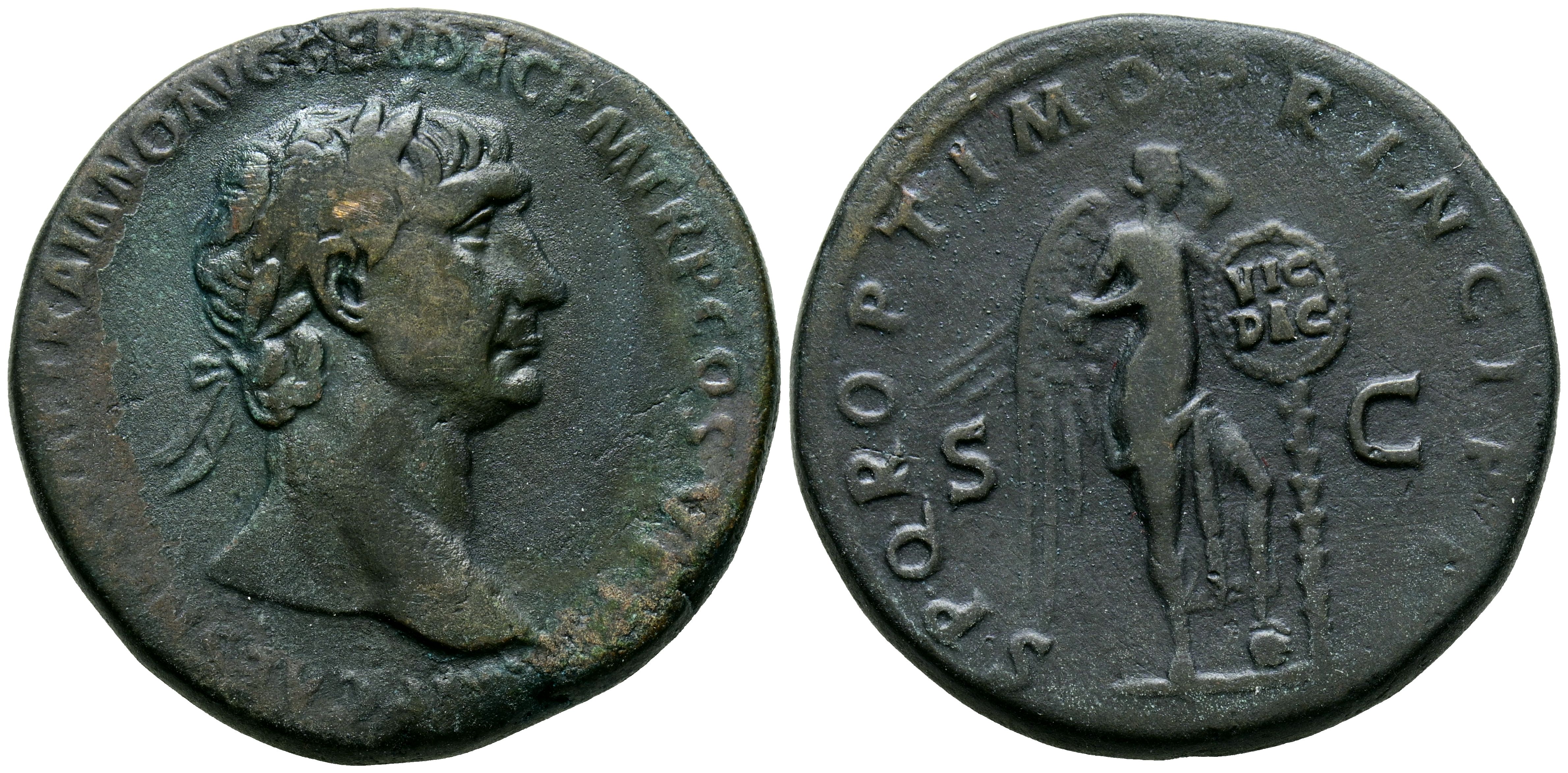 TRAJANO. Sestercio. (Ae. 23,76g/33mm). 104-107 d.C. Roma. (RIC 527). Anv: Cabeza laureada de trajano a derecha, alrededor leyenda: IMP CAES NERVAE TRAIANO AV GER DAC P M TR P COS V P P. Rev: Victoria estante a derecha con pie sobre globo, apoyada en escudo, con inscripción: VIC/DAC, en columna, entre: S-C, alrededor leyenda: SPQR OPTIMO PRINCIPI. MBC. Repasado.