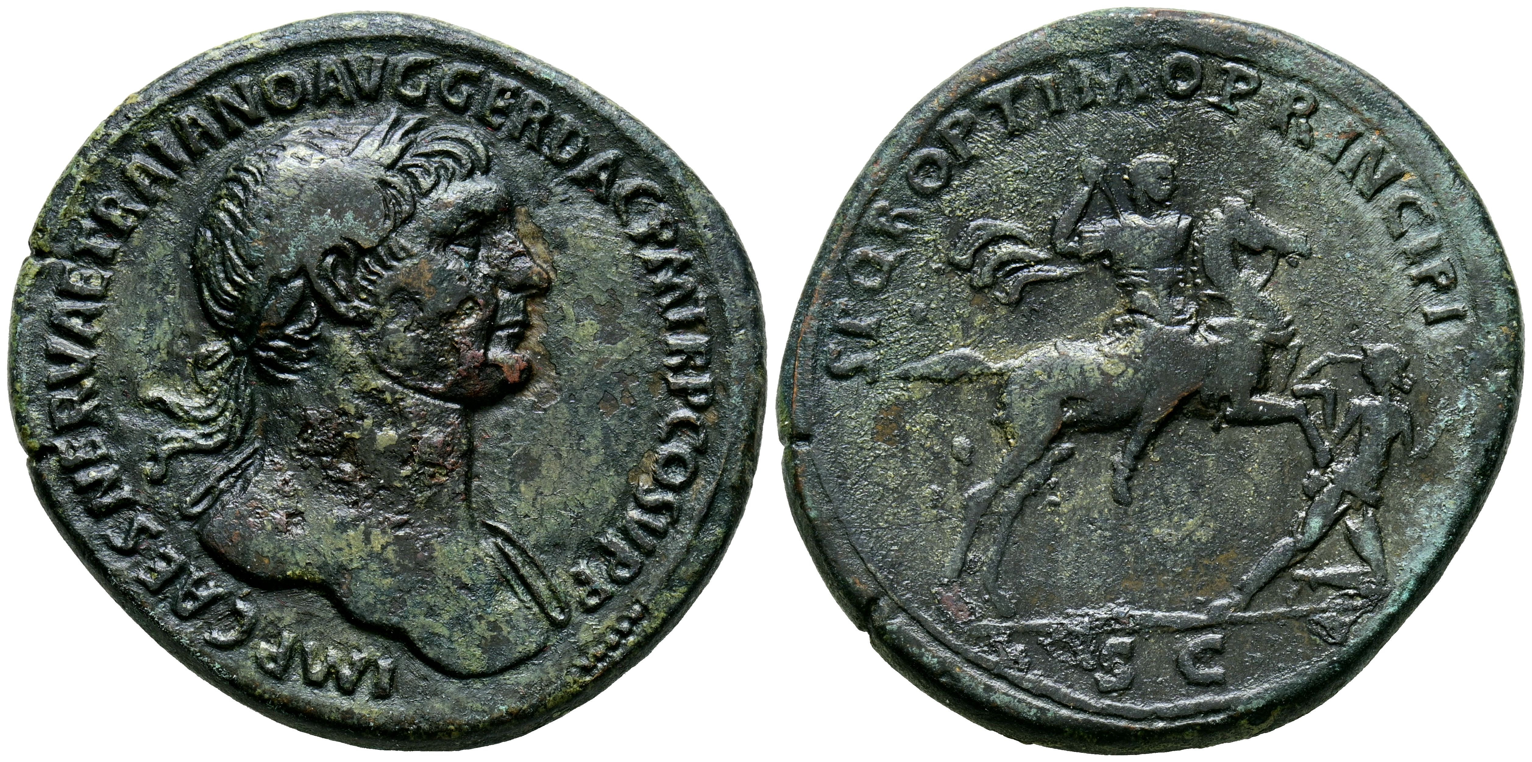 TRAJANO. Sestercio. (Ae. 26,28g/36mm). 105-107 d.C. Roma. (RIC 534). Anv: Busto laureado con ligero drapeado sobre hombro izquierdo a derecha de Trajano, alrededor leyenda: IMP CAES NERVAE TRAIANO AVG GER DAC P M TR P COS V P P. Rev: Trajano con atuendo militar portando lanza sobre caballo a derecha sobre Dacia, alrededor leyenda: S P Q R OPTIMO PRINCIPI. MBC+/MBC. Escaso. Campos rebajados.