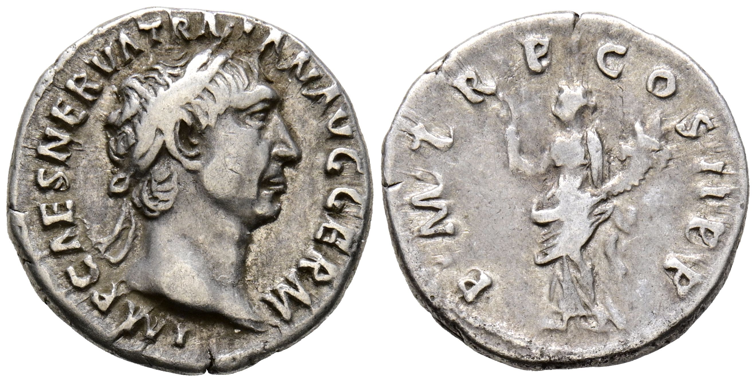 TRAJANO. Denario. (Ar. 3,55g/18mm). 98-99 d.C. Roma. (RIC 6). Anv: Cabeza laureada de Trajano a derecha, alrededor leyenda: IMP CAES NERVA TRAIAN AVG GERM. Rev: Felicitas estante a izquierda portando corona de laurel y cornucopia, alrededor leyenda: P M TR P COS II P P. MBC.