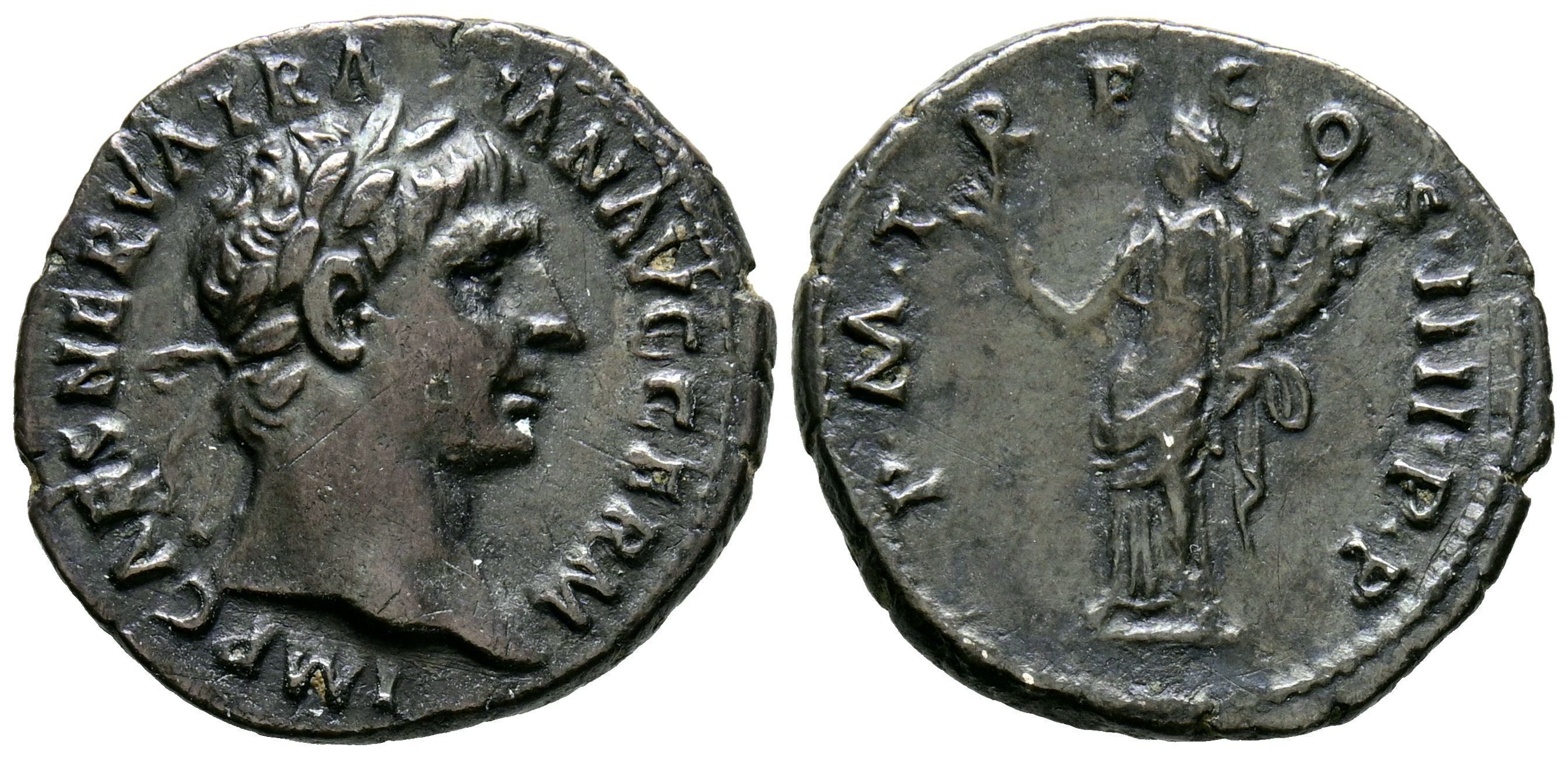 TRAJANO. Denario. (Ar. 3,21g/19mm). 98-111 d.C. Roma. (RIC 56). Anv: Busto laureado de Trajano a derecha, alrededor leyenda: IMP CAES NERVA TRAIAN AVG GERM. Rev: Pax estante a izquierda portando ramillete y cornucopia, alrededor leyenda: P M TR P COS IIII P P. MBC. Pátina oscura.