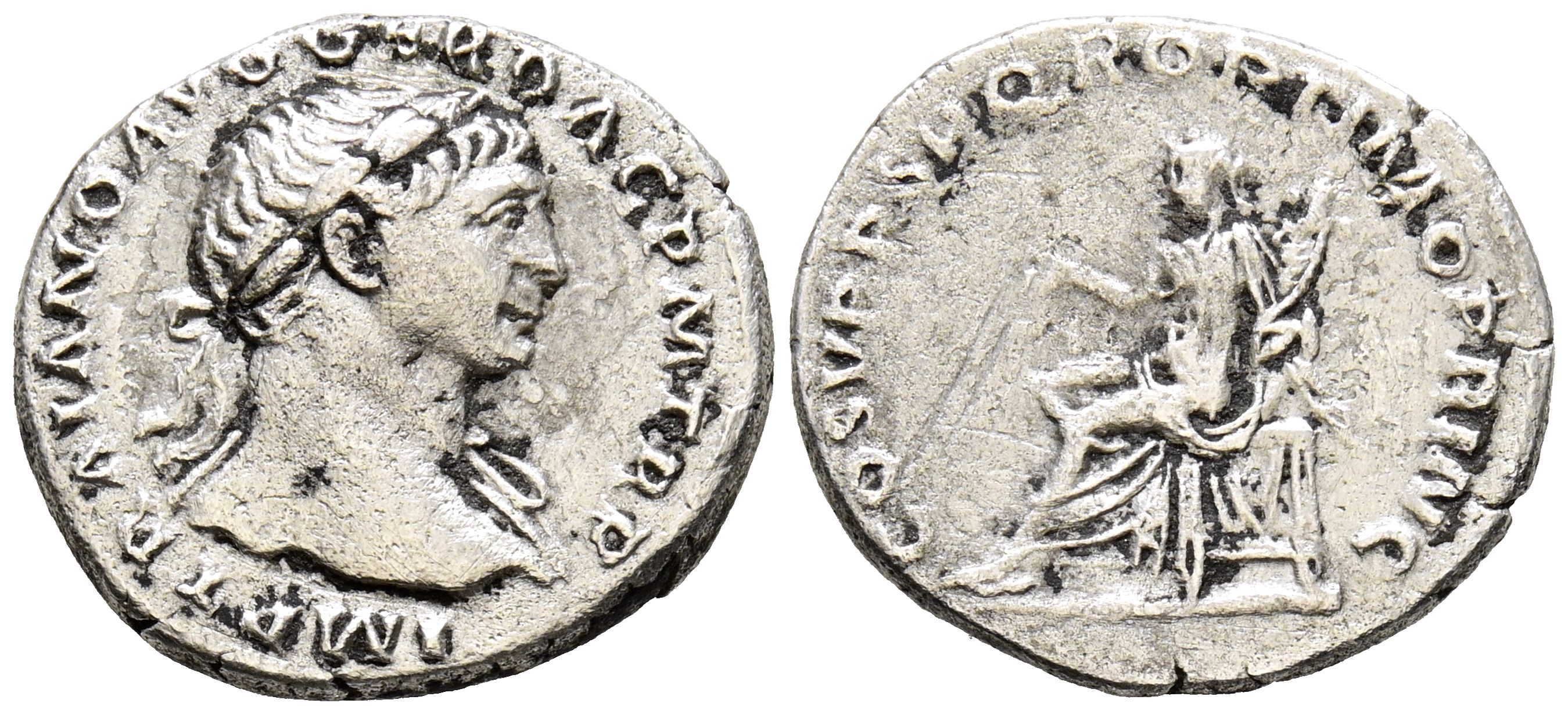 TRAJANO. Denario. (Ar. 3,25g/19mm). 108-109 d.C. Roma. (RIC 116). Anv: Cabeza laureada de Trajano a derecha, alrededor leyenda: IMP TRAIANO AVG GER DAC P M TR P. Rev: Roma sentada a izquierda portando lanza y portando Victoria con corona de laurel, alrededor leyenda: COS V P P SPQR OPTIMO PRINC. MBC.
