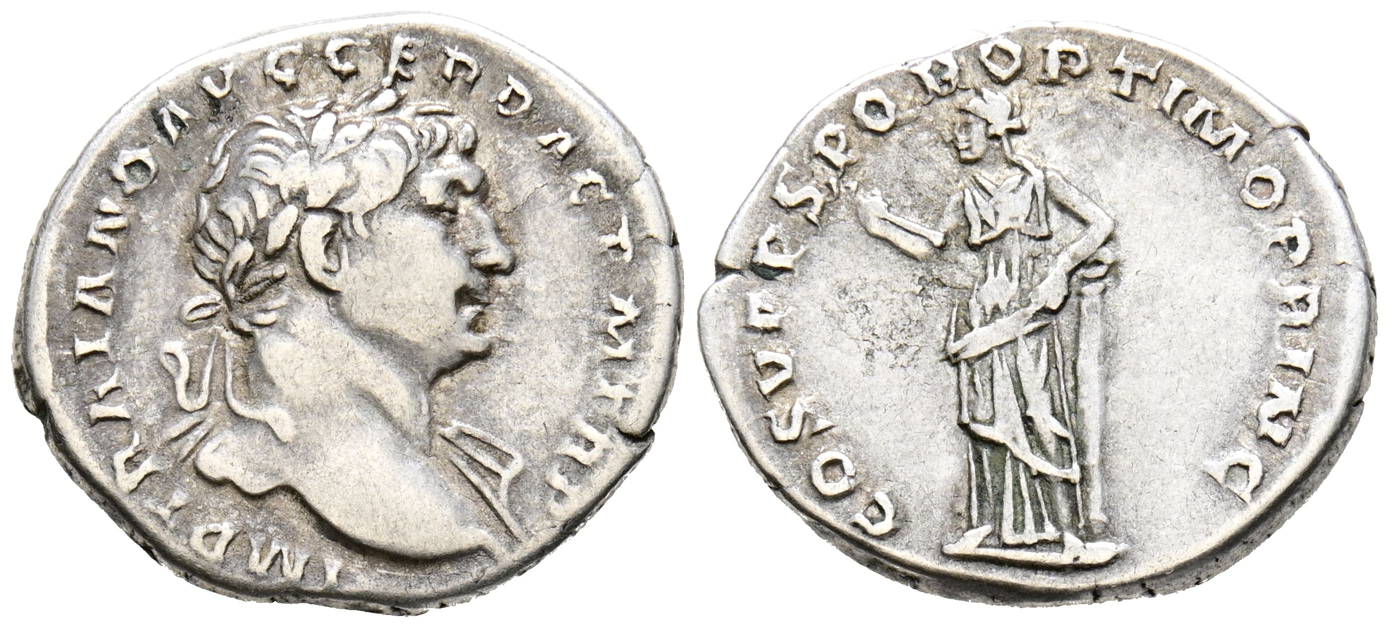 TRAJANO. Denario. (Ar. 3,30g/20mm). 103-111 d.C. Roma. (RIC 120). Anv: Cabeza laureada de Trajano a derecha, alrededor leyenda: IMP TRAIANO AVG GER DAC P M TR P. Rev: Felicitas estante a izquierda apoyada en columna portando caduceo, alrededor leyenda: COS V P P SPQR OPTIMO PRINC. MBC.