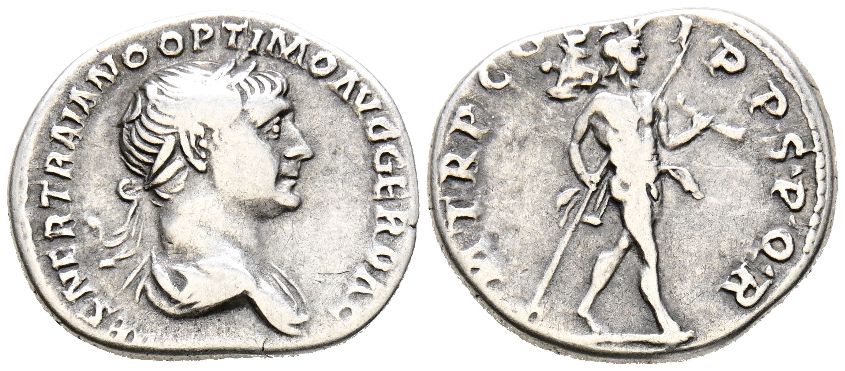 TRAJANO. Denario. (Ar. 3,23g/19mm). 112-114 d.C. Roma. (RIC 269). Anv: Busto laureado y drapeado de Trajano a derecha, alrededor leyenda: IMP CAES NER TRAIANO OPTIMO AVG GER DAC. Rev: Marte avanzando a derecha portando lanza y trofeo, alrededor leyenda: P M TR P COS VI PP SPQR. MBC.