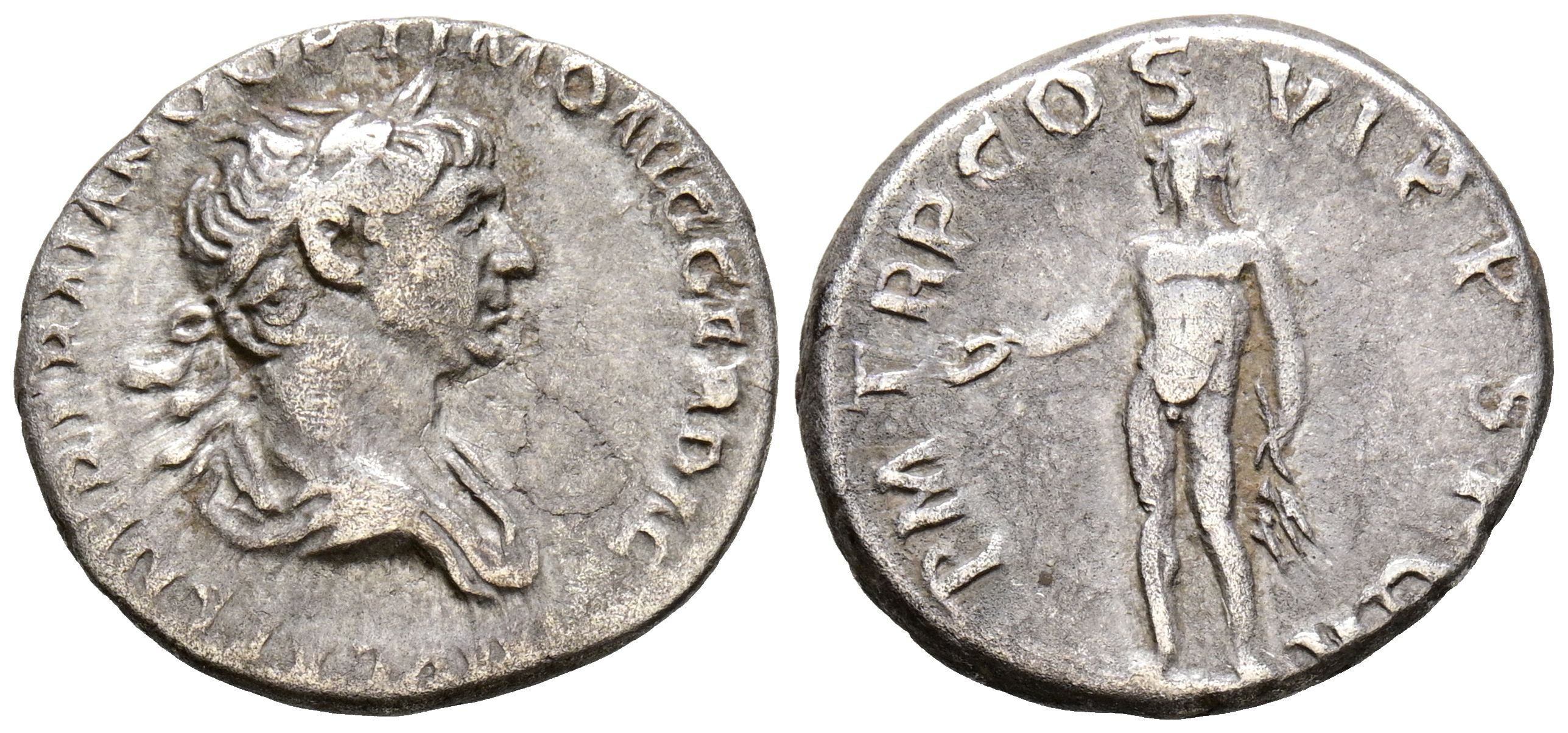 TRAJANO. Denario. (Ar. 3,41g/18mm). 114-116 d.C. Roma. (RIC 347). Anv: Busto laureado y drapeado de Trajano a derecha, alrededor leyenda: IMP CAES NER TRAIANO OPTIMO AVG GER DAC. Rev: Genio estante a izquierda portando patera, alrededor leyenda: P M TR P COS VI P P SPQR. MBC.
