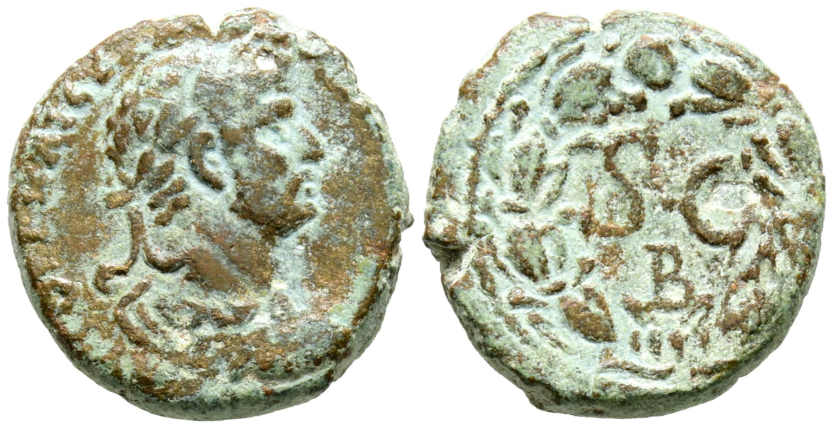 ADRIANO. Ae19. (Ae. 5,62g/19mm). 117-138 d.C. Antioquía, Seleucis y Pieria. (RPC 3721). Anv: Busto laureado, drapeado y coraza de Adriano a derecha, alrededor leyenda: AVTOKP KAIC TP AIAN AΔPIANOC CЄΒ. Rev: SC debajo B, todo dentro de corona de laurel. MBC-.