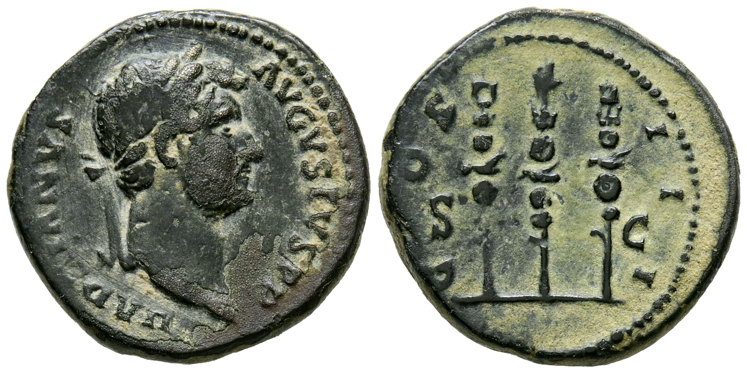 ADRIANO. Cuadrante. (Ae. 4,18g/18mm). 125-128 d.C. Roma. (RIC 689). Anv: Cabeza laureada de Adriano a derecha, alrededor leyenda: HADRIANVS AVGVSTVS. Rev: Aguila imperial sobre tres estandartes, en exergo: SC, alrededor leyenda: COS III. MBC.