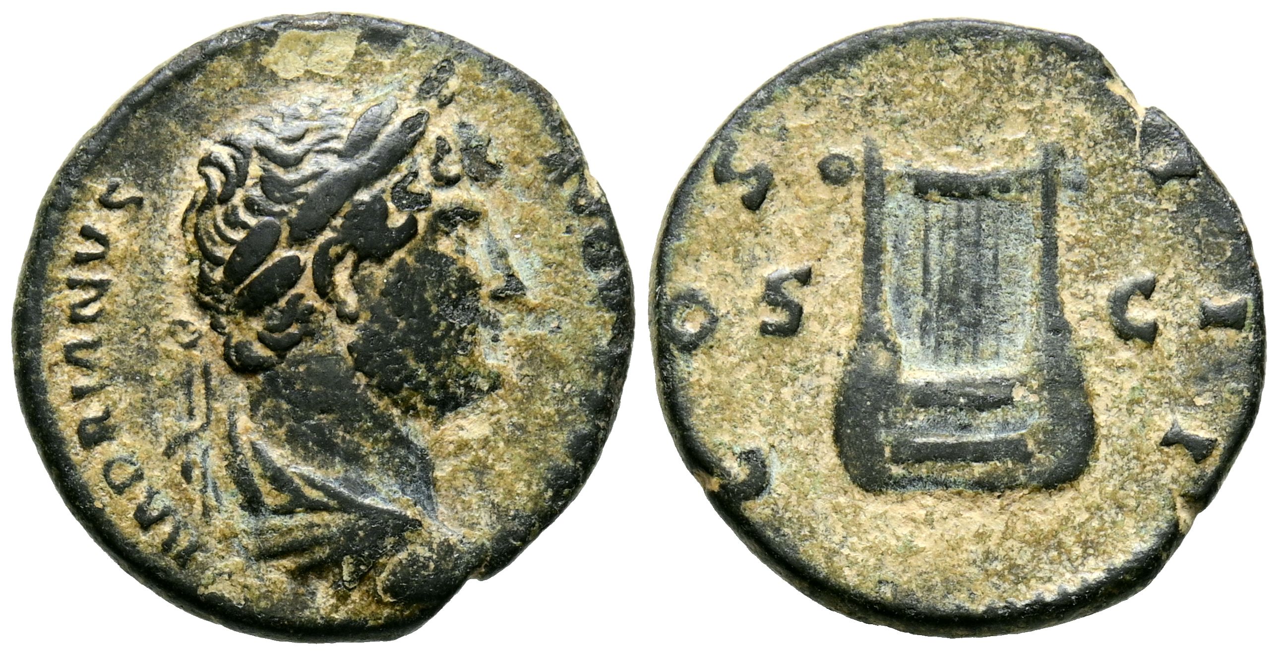 ADRIANO. Semis. (Ae. 3,16g/18mm). 117-138 d.C. Roma. (RIC 688). Anv: Busto laureado, drapeado y coraza de Adriano a derecha, alrededor leyenda: HADRIANVS AVGVSTVS. Rev: Lira, en campo S-C, alrededor leyenda: COS III. MBC.