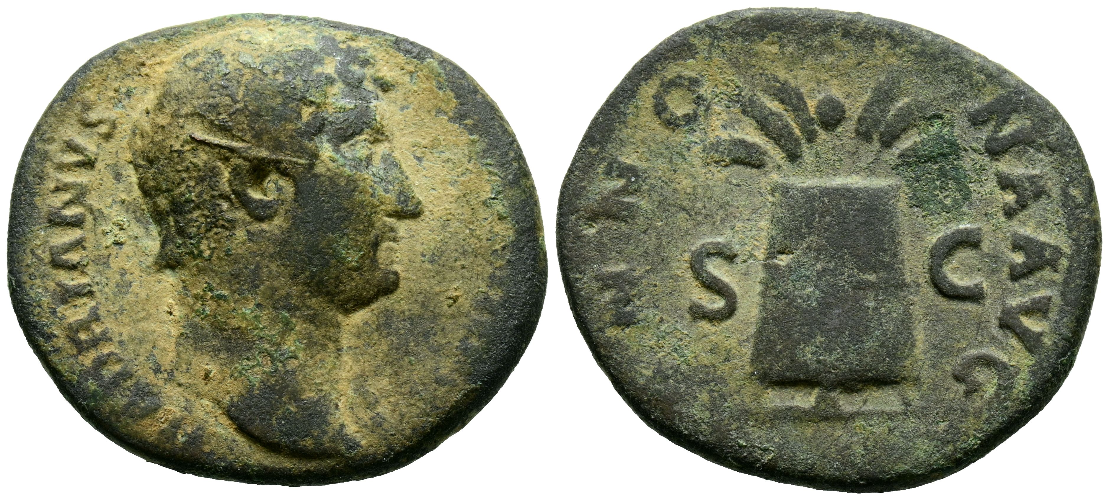 ADRIANO. As. (Ae. 8,85g/26mm). 117-138 d.C. Roma. (RIC 2378). Anv: Busto laureado de Adriano a derecha, alrededor leyenda: HADRIANVS AVG COS III P P. Rev: Modio con espigas y amapolas, en campo: S-C, alrededor leyenda: ANNONA AVG. BC+.