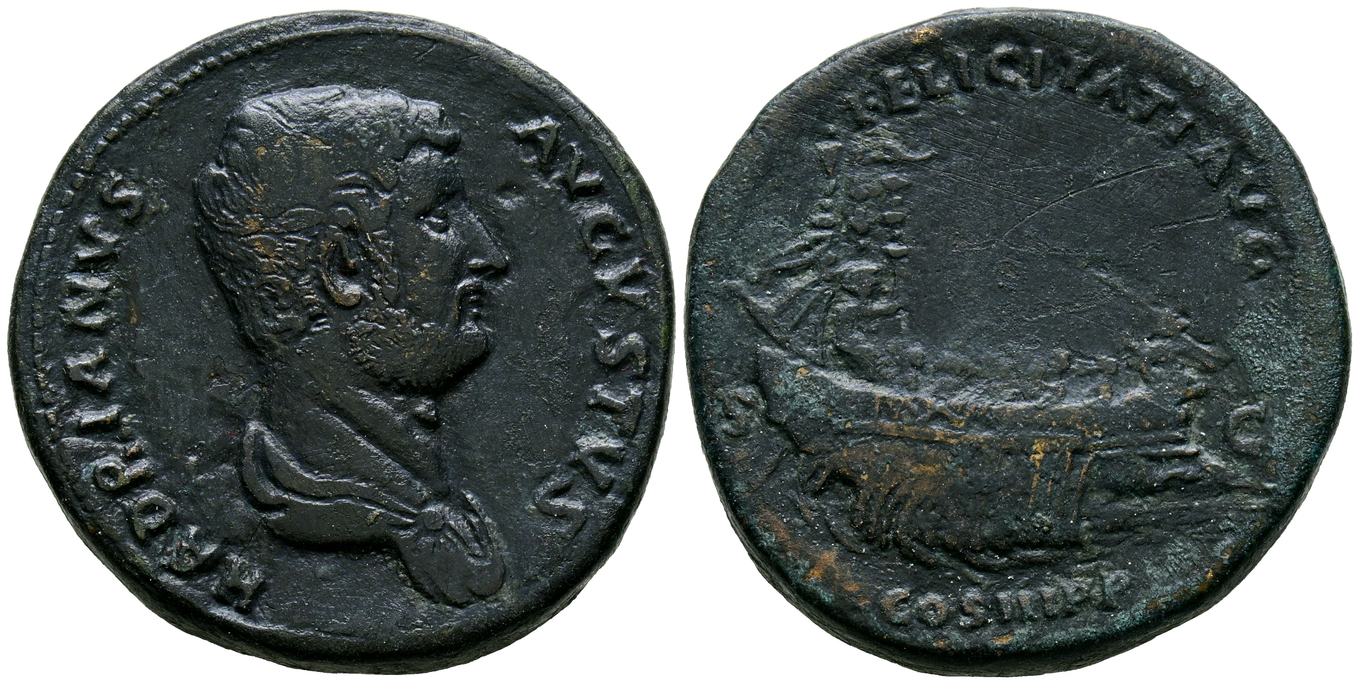 ADRIANO. Sestercio. (Ae. 24,47g/31mm). 129-130 d.C. Roma. (RIC 1336). Anv: Busto drapeado a derecha de Adriano, alrededor leyenda: HADRIANVS AVGVSTVS. Rev: Galera a derecha, en ella tres estandartes, entre S-C, encima: FELICITATI AVG, debajo: COS III P P. MBC. Retocado y repatinado.