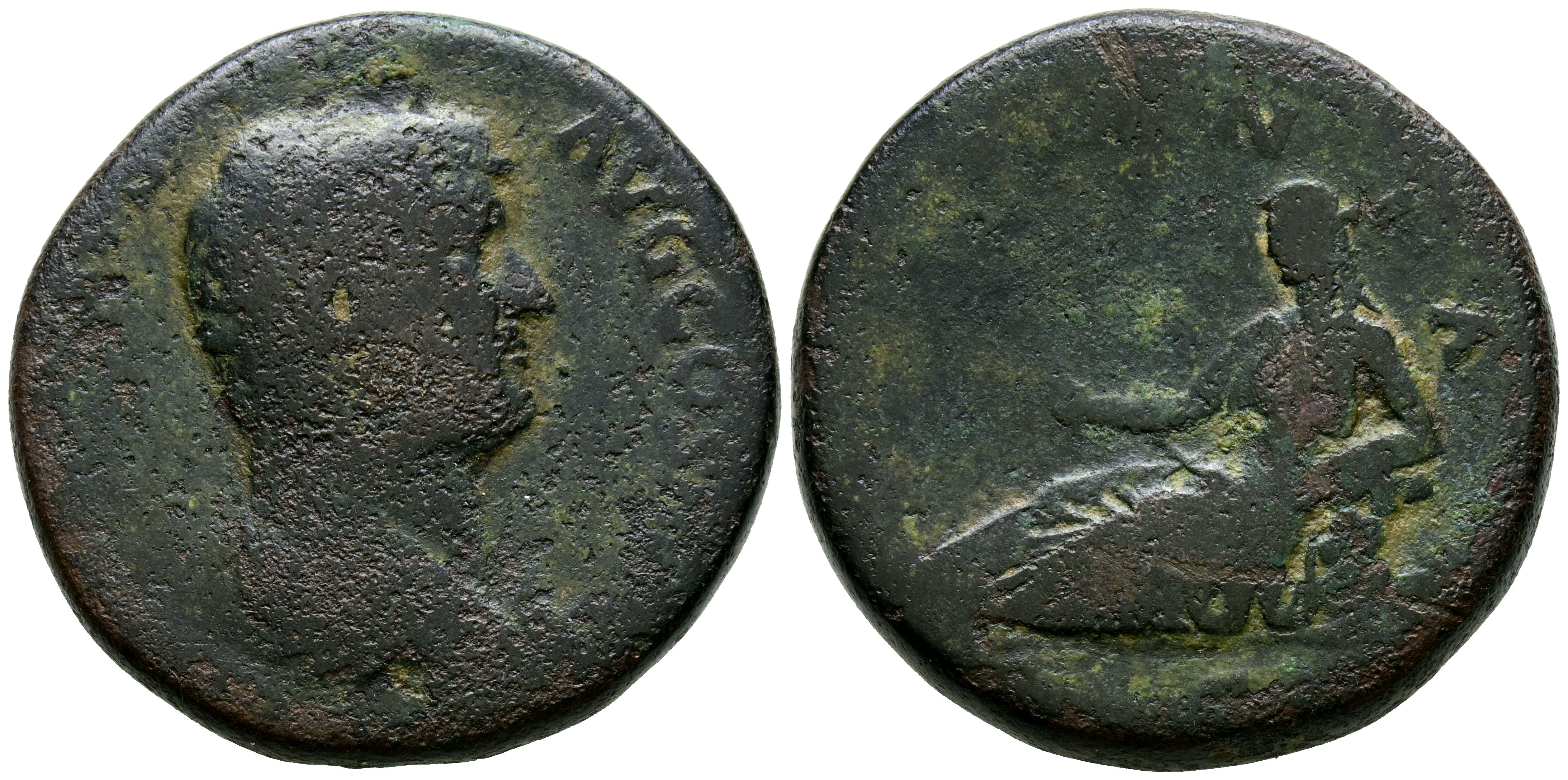 ADRIANO. Sestercio. (Ae. 23,83g/31mm). 130-133 d.C. Roma. (RIC 1665). Anv: Busto drapeado de Adriano a derecha, alrededor leyenda: HADRIANVS AVG COS III P P. Rev: Hispania tumbada a izquierda portando rama y apoyada sobre roca, debajoa: SC, encima: HISPANIA. BC.