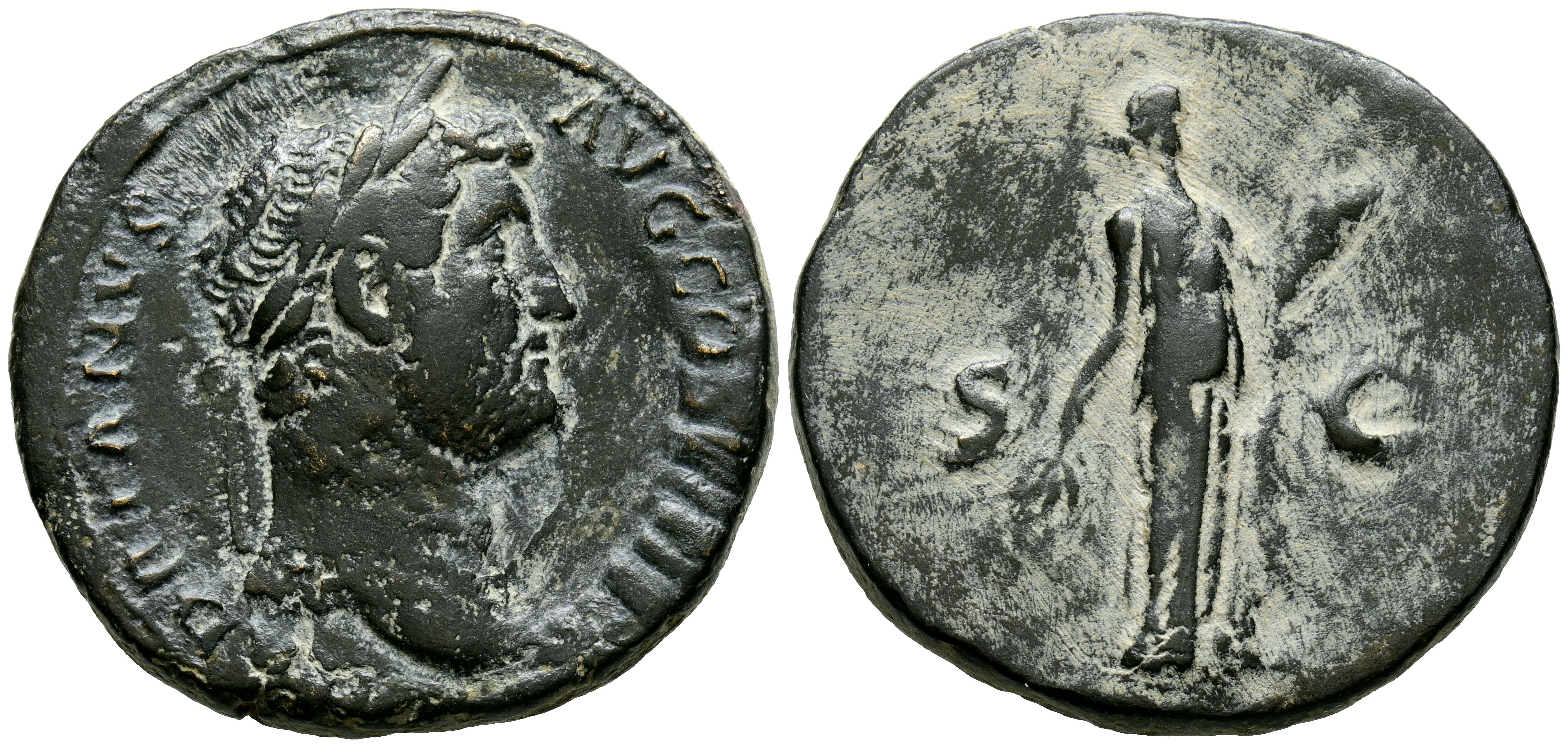 ADRIANO. Sestercio. (Ae. 20,95g/32mm). 130-138 d.C. Roma. (RIC 2266). Anv: Cabeza laureada de Adriano a derecha, alrededor leyenda: HADRIANVS AVG COS III P P. Rev: Fides estante a derecha sosteniendo portando espigas y plato con frutas, entre S-C, alrededor leyenda: FIDES PVBLICA. BC+. Repasada y repatinada.