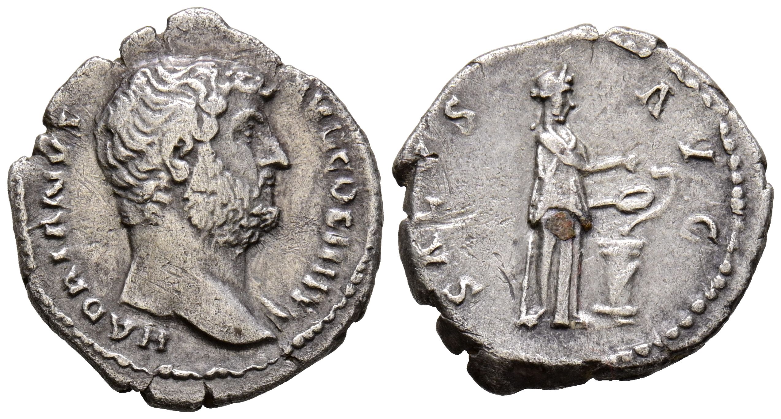 ADRIANO. Denario. (Ar. 2,84g/19mm). 134-138 d.C. Roma. (RIC 267). Anv: Cabeza de Adriano a derecha, alrededor leyenda: HADRIANVS AVG COS III P P. Rev: Salus estante a derecha alimentando a serpiente en columna de patera, alrededor leyenda: SALVS AVG. MBC. Concreción en reverso.