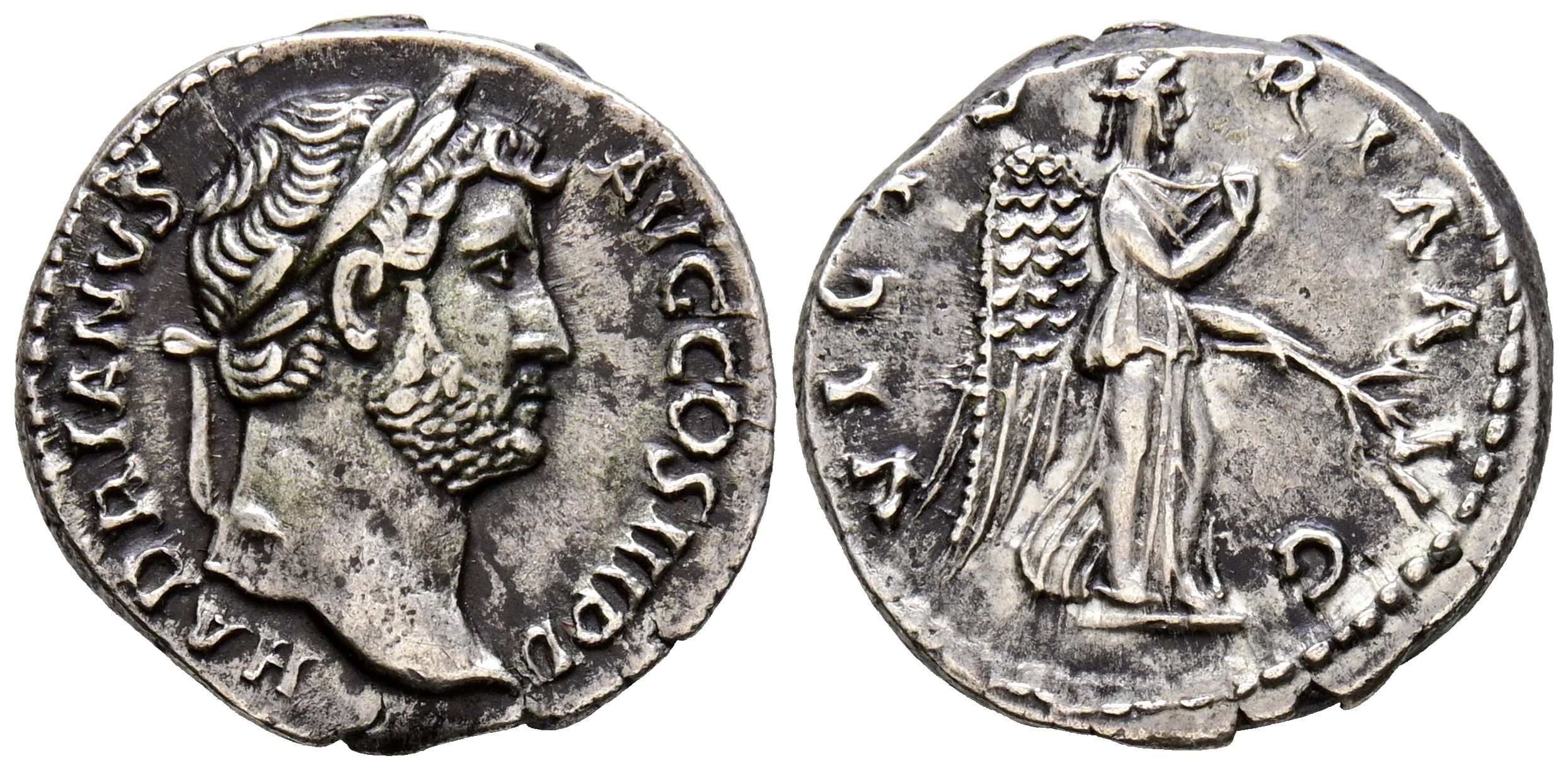 ADRIANO. Denario. (Ar. 3,32g/17mm). 136 d.C. Roma. (RIC 2239). Anv: Cabeza laureada de Adriano a derecha, alrededor leyenda: HADRIANVS AVG COS III P P. Rev: Victoria estante a derecha portando rama, alrededor leyenda: VICTORIA AVG. MBC+.
